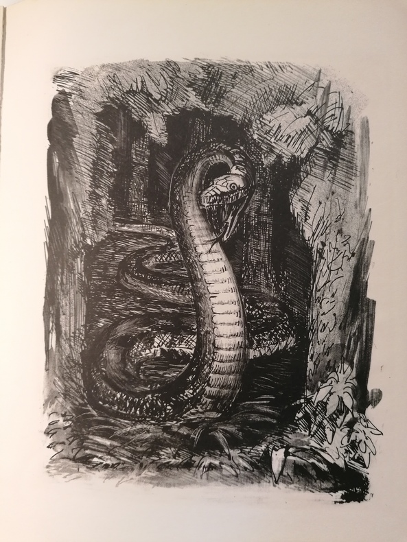 P., Editions Eos 1926 Grand in-4, plein maroquin, plats et contreplats en peau de serpent, double filet doré en encadrement, couv. en coul. imitant la peau de serpent conservées, étui, 22 f. n. ch. de texte, 15 lithographies originales de Jean Marchand dont 6 hors-texte et 9 in-texte et 31 gravures originales in texte vingt-quatre bandeaux et sept culs de lampe gravées sur bois au canif de Sonia Lewitska. Charnières et mors fendillés très fragiles, menus frottements. Bel état intérieur.