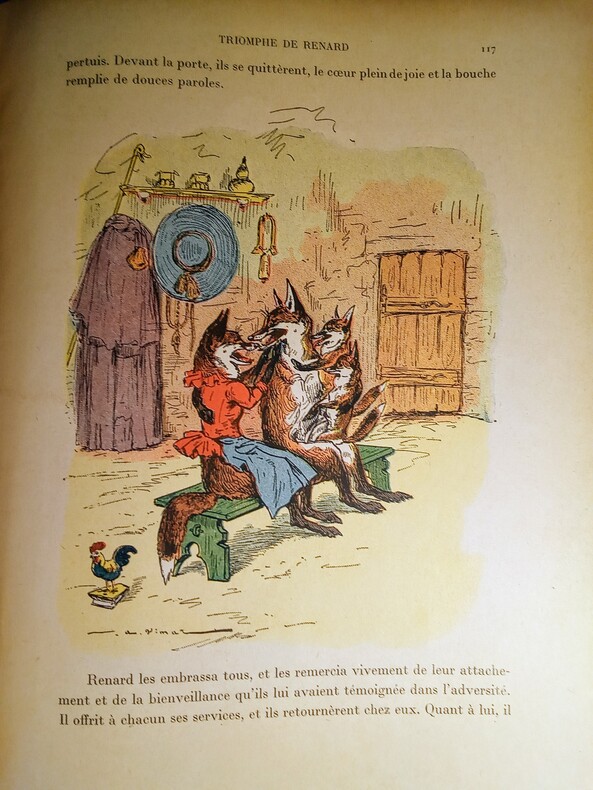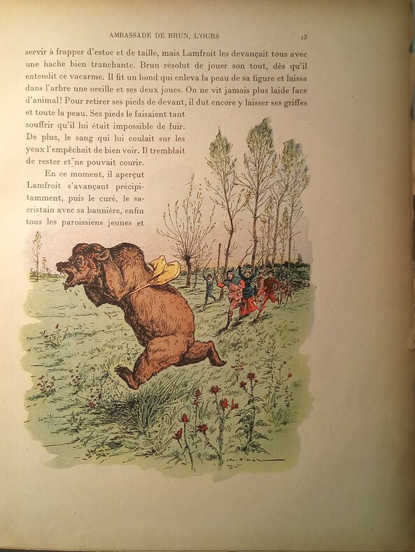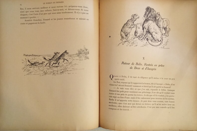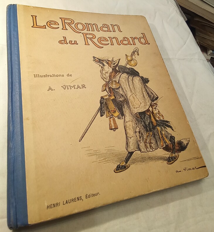 petit in 4 cartonné, dos pincé toilé rouge, premier illustré en couleurs. La naissance de Renard 32 pages, Les mésaventures de BRUN ambassadeur 32 pages, Le procès de Renard 32 pages, Comment Renard fut contraint d’aller à Rome 32 pages. Illustrations en couleurs dans le texte et hors texte de J.SAUNIER. Edition BIAS. Sans date. Rousseurs au deuxième plat de couverture, coupe frottée, par endroits.