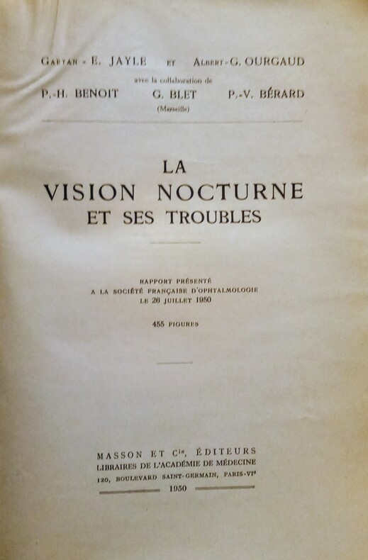par Gaëtan–E. Jayle et Albert – G. Ourgaud avec la collaboration de P.-H. Benoit; G. Blet et P.-V. Bérard – Rapport présenté à la Société Française d'Ophtalmologie le 20 juillet 1950. Illustré de 455 figures. Paris, Masson et Cie, éditeurs, 1950. Grand in-8 (25x3,5x16,5cm) broché. VIII,863pp.