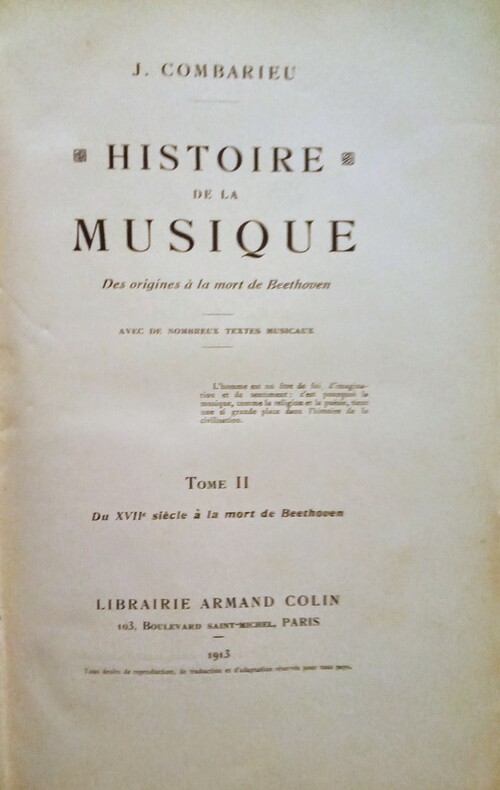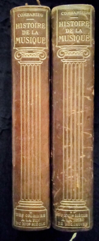 Des origines à la mort de Beethoven. Avec de nombreux textes musicaux. Tome 1: Des origines à la fin du XVIème siècle. Tome 2: Du XVIIème siècle à la mort de Beethoven. Paris, Librairie Armand Colin, 1913. 2 volumes in-8 (23x4x14cm) reliée demi basane marron, dos lisse avec légendes dorés, et filets verticales dorés, têtes dorées et dos légèrement passés. X,651pp. + 703pp.