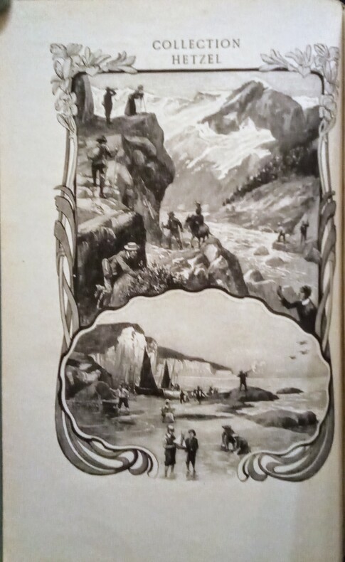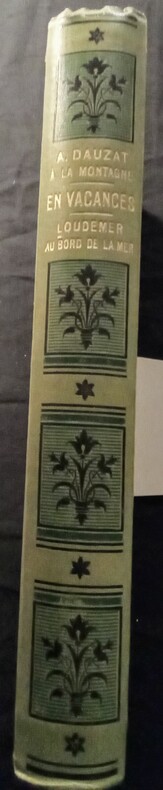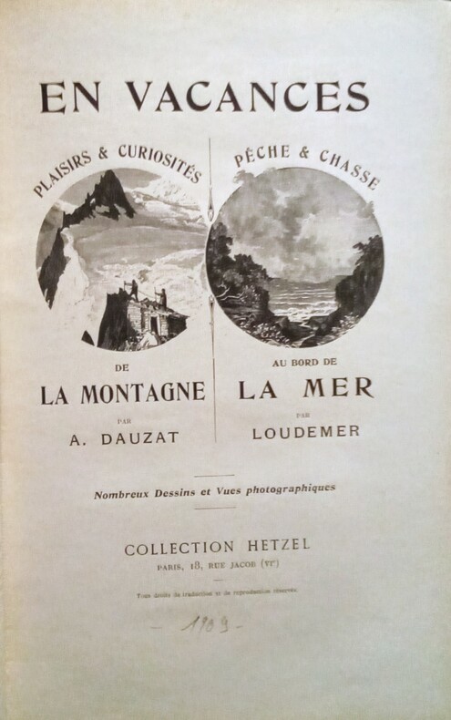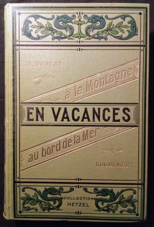 Plaisirs et Curiosités de La Montagne, par A. Dauzat suivi de: Pêche et Chasse au Bord de La Mer, par Loudemer. Nombreux Dessins et Vues photographiques. Paris, Collection Hetzel, sans date (vers 1909). Grand in-8 (25x3x16,5cm) de cartonnage vert pomme orné d'encadrements et dragons avec les légendes en or et noires, dos orné de motifs plantes dans des caissons, et titre doré, tranches dorées, plat inférieur au logo Hetzel. VIII,328pp.