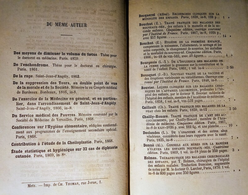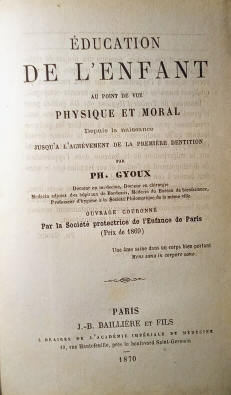 Depuis la naissance jusqu'à l'achèvement de la première Dentition. Paris, J.-B. Baillière & fils, 1870. Petit in-8 (18x12cm) relié demi toile beige. II,324pp.