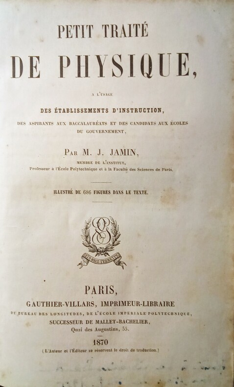 ---- EDITION ORIGINALE ---- BEL EXEMPLAIRE ---- "Jules Jamin, (1818/1886), fut membre, puis secrétaire perpétuel de l'Académie des Sciences. Il est l'auteur de mémoires sur la constitution des aimants. On lui doit un dispositif (miroirs de Jamin) producteur de franges d'interférences. Il mesura les indices de réfraction des gaz et étudia l'absorption des radiations lumineuses et infrarouges" ---- Pesanteur et élasticité - Chaleur - Electricité statique - Electro-dynamique - Electro-magnétisme - Acoustique - Optique**2788/M7DE