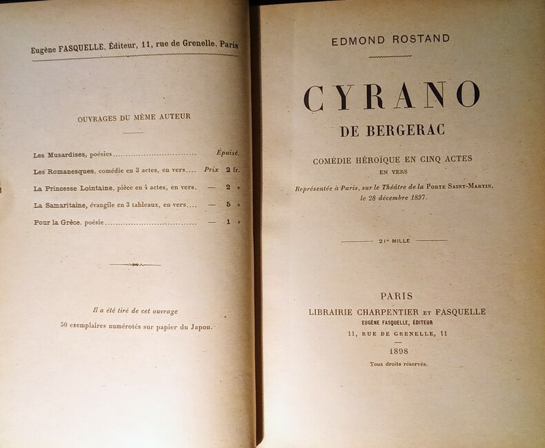 First edition, 136th thousand (same year as the first), presentation-copy ""à M. Eugène Zabel/ très cordial envoi, -/ remerciement, -/ et sympathie./ Edmond Rostand/ Octobre 98"" of Rostand's masterpiece, which against all odds became one of the most popular plays of the century and an overnight success throughout Europe.At the end of the 19th century in France, as well as in the rest of Europe, the industrialization was the force that dominated almost all aspects of society, i.e. everything from politics and sociology to science, art, philosophy, etc. And thus, also literature and theatre in this period were products of this new power. This meant that the trend that became prevailing within literature and drama was that of realism, which in France soon developed into naturalism. In the midst of this all-encompassing emphasis on objective documentation of everyday life which rejected romance, idealization and dreaming of any kind, emerged suddenly a work that no one could believe would have any success whatsoever, but which against all odds became the hugest dramaturgical success of the period and a theatrical monument that has been remembered ever since and which still stands as thus: Rostand's ""Cyrano de Bergerac"", the unlikely play about romantic heroes, fairy-tale like maidens, medieval-inspired sword-fights, about poetry, love, and art. The play had been taken on already in 1897, when the manuscript was finished, but the directors of the theatre regretted their decision immediately, not least due to the public reaction to the ""outdated"" romantic comedy-drama, which nobody would want to go see, and thus they severely cut the budget so that Rostand had to pay for all the costumes himself. Even the actor playing the main part, a leading actor at the time, regretted having taken the part, and Rostand is reported to have apologized to him for involving him in this ""disastrous adventure"". ""Therefore, when the curtain rose on ""Cyrano de Bergerac"" for the first time on December 28, 1897, expectations were low. The audience, however, was about to be pleasantly surprised. From the hero's last first majestic entrance to his last farewell, he transfixed his viewers. Theatergoers cheered Cyrano's triumphs, sighed at his suffering, laughed at his witty wordplay, and cried as his fate became known. A full hour after the curtain fell, the audience was still applauding thunderously. It is not easy to explain why Rostand's play confounded everyone by becoming one of the century's greatest smash hits. Perhaps the answer lies in ""Cyrano de Bergerac's"" stark contrast to the grimly realistic plays of its day, which often focused on modern society's darkest problems. The figure of the swashbuckling Cyrano dueling his way across the stage and stunning his compatriots with his verbal cleverness took Paris by storm. In fact, many critics, both of Rostand's time and later, attributed the play's tremendous success to its romanticism, or emphasis on idealism and heroism."" (Glencoe Literature Library, Study Guide for Cyrano de Bergerac).The work immediately became a huge success and within a very short amount of time, it had been translated into almost all European languages and was performed at theatres throughout Europe.Eugen Zabel was a famous literary critic and author, who at the time of ""Cyrano de Bergerac"" was editor of the ""Nationalzeitung"". He was born in Königsberg in 1851 and died in Berlin in 1925. In his youth he wrote poems, and after his move to Berlin, he worked as a journalist, critic, and writer. He did a lot of work on Russian themes, both political, historical, topographical, and literary, and he became closely connected to the country. He was highly respected for his liiterary criticism and his opinions, though often controversial, played an important role in public opiniation.