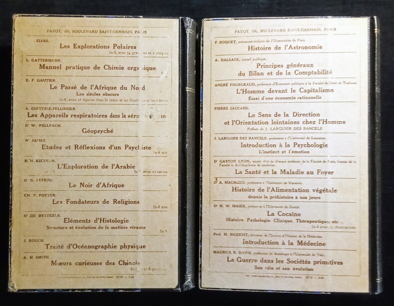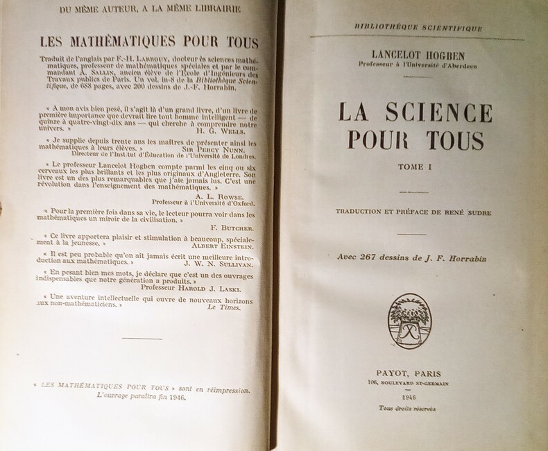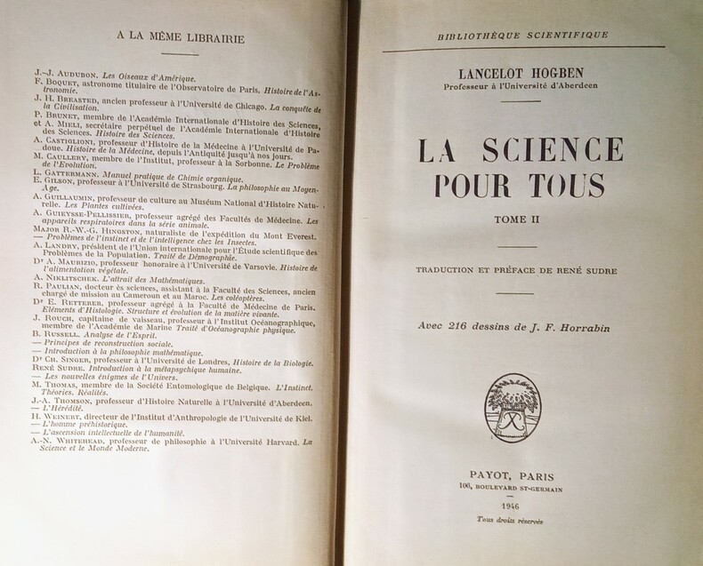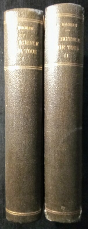 Tome I: La Conquête du Calcul du Temps de la Mesure de l'Espace. Les Lois du Mouvement. La Conquête des Succédanés. Traduction et préface de René Sudre. Avec 267 dessins de J. F. Horrabin. Tome II: La Conquête de l'Énergie. La Victoire sur la Faim et la Maladie. La Maîtrise de la Conduite. Traduction et Préface de René Sudre. Avec 216 dessins de J. F. Horrabin. Paris, Payot, 1946. 2 volumes in-8 (22,3x14cm) reliés demi cartonnage marron foncé, auteur, titre dorés au dos, plats recouverts des couvertures d'origines. 660pp. + 687pp.