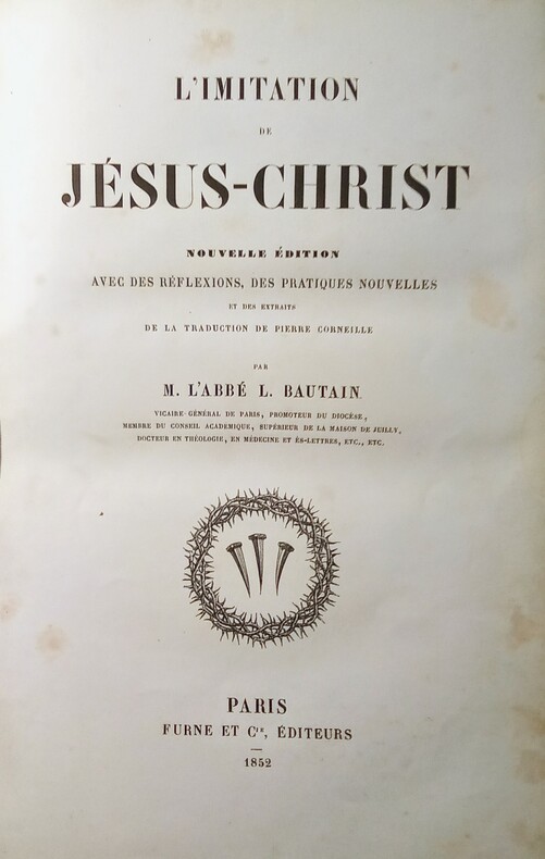 traduction nouvelle avec des réflexions à la fin de chaque chapitre et précédée de prières pendant la messe vol relié demi cuir, in12, 170x130, frottements, bon état int. 549pp Paris. Edme & Picard 1839 Abbé Félicité de La Mennais était un prêtre catholique français et un écrivain religieux du XIXe siècle. Il est connu pour son rôle dans le mouvement du catholicisme libéral et pour son engagement en faveur de la liberté religieuse et de la démocratie. Il s'agit de son adaptation de "L'Imitation de Jésus-Christ". "L'Imitation de Jésus-Christ" est un livre de dévotion qui vise à guider les lecteurs dans leur vie spirituelle en s'inspirant de l'exemple de Jésus-Christ. Il explore des thèmes tels que la piété, la humilité, l'obéissance, la renonciation aux plaisirs terrestres, la prière et la contemplation de la vie de Jésus. L'ouvrage est divisé en plusieurs chapitres ou courts textes qui abordent différents aspects de la vie chrétienne. Il encourage les lecteurs à se rapprocher de Dieu, à cultiver la vertu et à vivre une vie centrée sur l'amour et le service envers les autres. "L'Imitation de Jésus-Christ" a été traduit dans de nombreuses langues et a été largement lu et étudié par des chrétiens du monde entier. Il continue d'être une source d'inspiration pour de nombreux croyants et reste une référence majeure de la spiritualité chrétienne. ref/c85