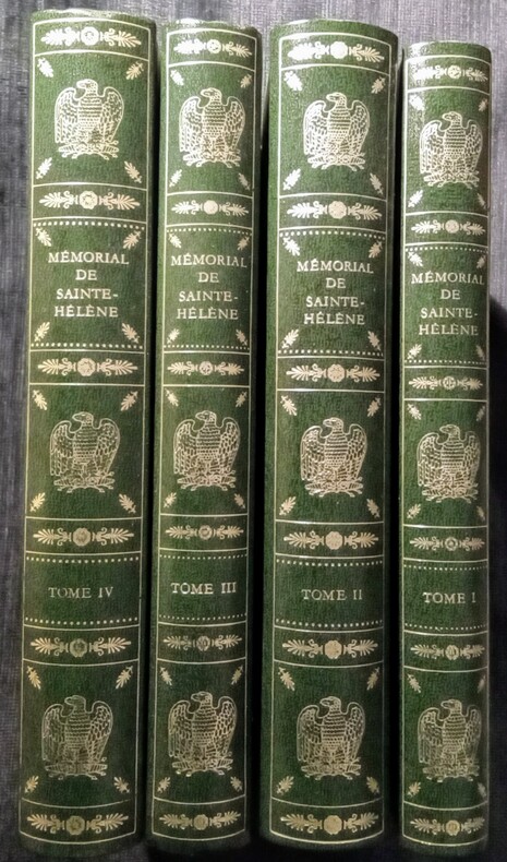 1823 Paris, Dépôt du Mémorial, Bossange frères, Béchet Ainé, Roret, 1823-1824, (Imprimerie de Lebègue), 8 tomes en 8 vol. in 8 de , 486 pp.,1 carte repliée de Sainte-Hélène ; 472 pp. et 1 tableau replié hors-texte (Tracé de Longwood) ; 464 pp. et 1 carte repliée hors-texte (carte pour l'intelligence de quelques chapitres de la Campagne d'Italie dictée par Napoléon) ; 469)-(2) pp. (annonce du libraire) pp. ; 460 pp. ; 462 pp. ; 468 pp., reliure d'époque demi-veau marron, dos lisses ornés de filets et roulettes dorées, fleurons et roulettes dentelées à froid, pièces de titres et de tomaisons rouges, réparations aux reliures, rousseurs éparses, bon ex.