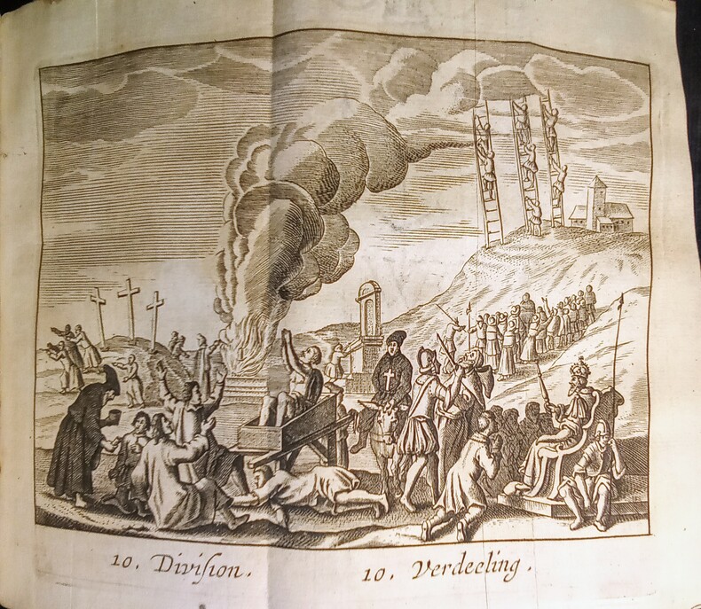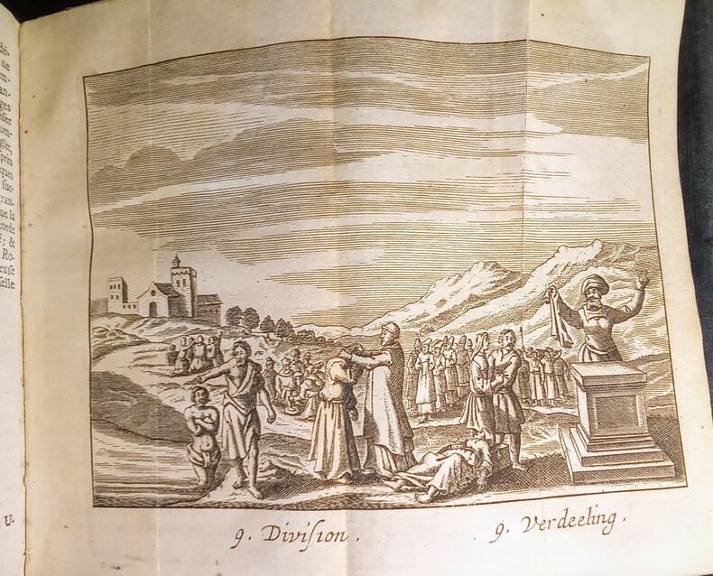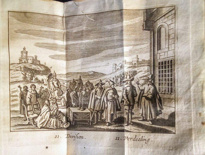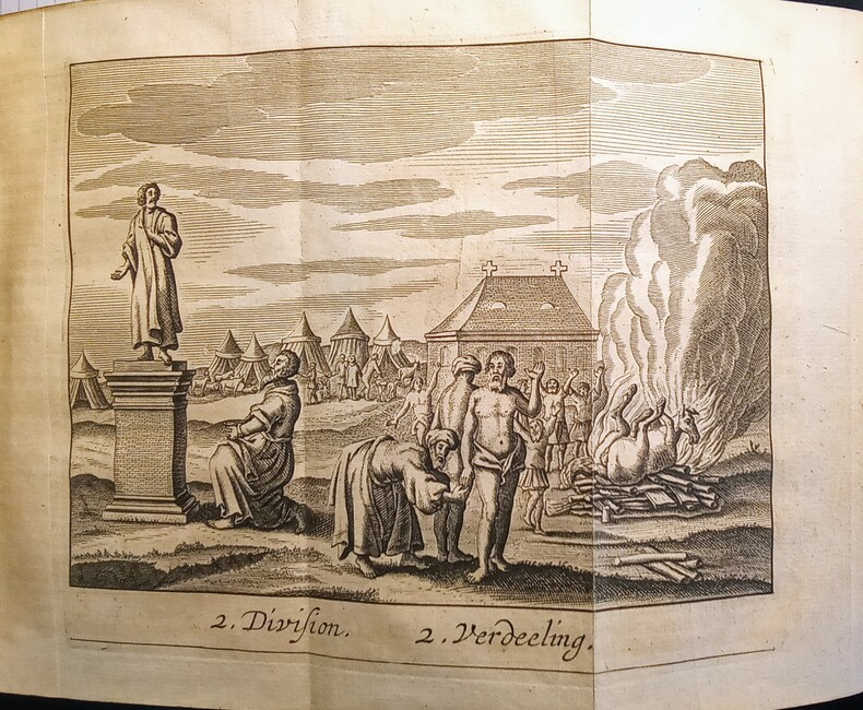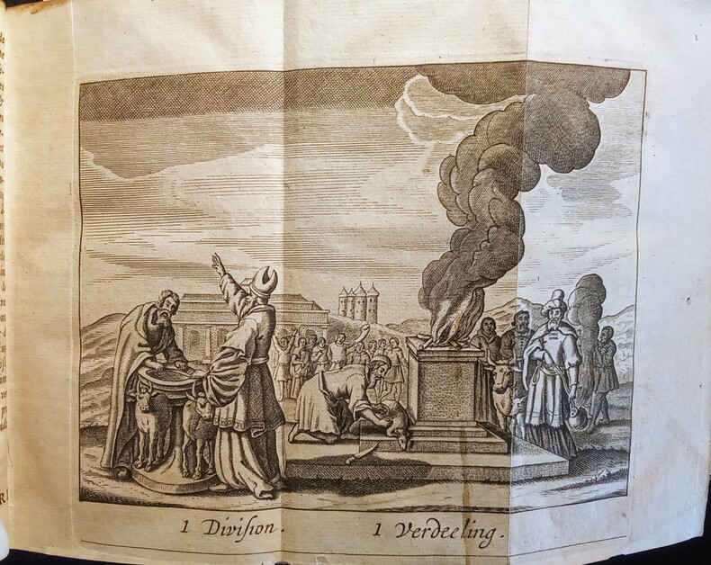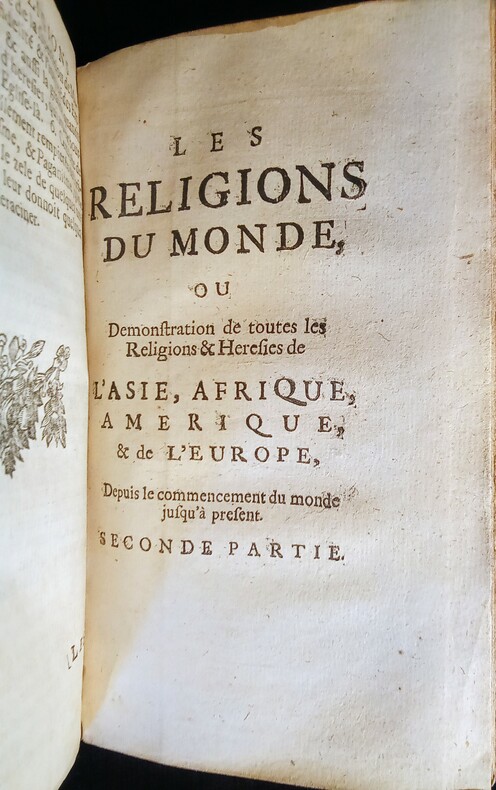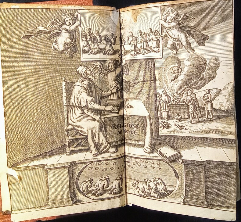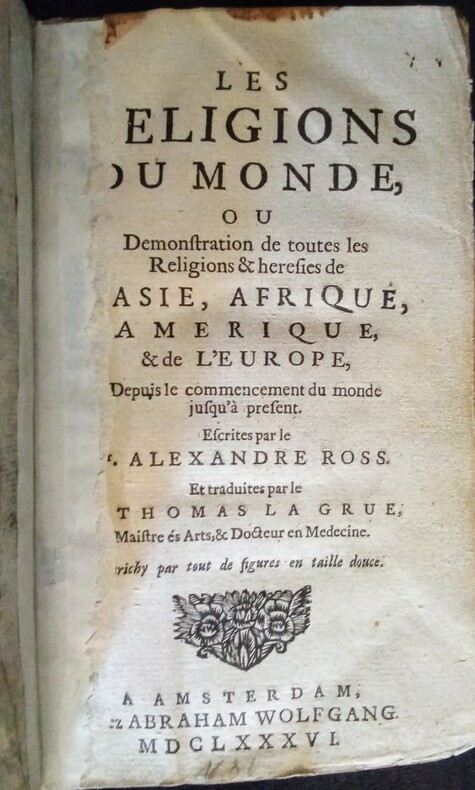 Ou Démonstration de toutes les Religions & hérésies de l'Asie, Afrique, Amérique, & de L'Europe, depuis le commencement du monde jusqu'à présent. Escrites par le Sr Alexandre Ross et traduites par Sr. Thomas La Grue. Enrichy par des figures en taille, 15 figures repliées. Amsterdam, Abraham Wolfgang, 1686. Fort in-12 (15,8x6x9cm) relié plein veau d'époque, dos lisse, charnière supérieure fendue et manque à la coiffe supérieure. Ouvrage en 3 parties de pagination continue 6ff.(titre et préface),887pp.+12 pp.(tables et registre des figures).