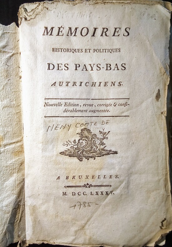 Édition originale publiée l'année de la mort de son auteur Patrice-François de Neny (Bruxelles 1716-1784), un an après avoir renoncé au poste de chef et président du Conseil privé qu'il occupait depuis 1758 : cette année-là, Vienne lui avait commandé un mémoire sur les institutions des Pays-Bas, afin de compléter l'éducation de l'Archiduc Joseph, futur Joseph II ; ces Mémoires Historiques et Politiques ne furent publiés qu'en 1784. Partisan des idées nouvelles, Neny appuya la politique centralisatrice de la monarchie autrichienne et conduisit une politique de modernisation en matière d'enseignement et de religion. Économiste et diplomate, il contribua à régler les nombreux litiges frontaliers des Pays-Bas autrichiens. Le portrait manque. Deux petits accidents sur le dos et le plat supérieur. Trace de mouillure dans la marge supérieure mais très bon exemplaire.