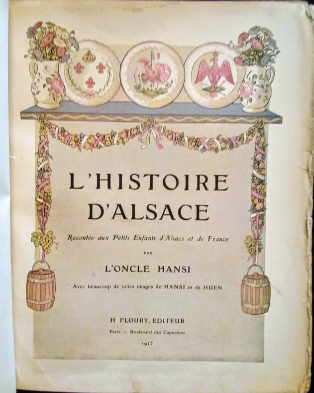 Racontée aux Petits Enfants d'Alsace et de France, par l'Oncle Hansi. Avec beaucoup de jolies images en couleurs dans le texte et hors-texte de Hansi et de Huen. Paris, H. Floury, Éditeur, 1915. In-folio (35,5x28cm) de percaline éditeur bleue très passée avec restaurations, charnières de gardes intérieures fendues avec traces de scotchs, coins écornés, et quelques restaurations sur quelques pages. 104pp.