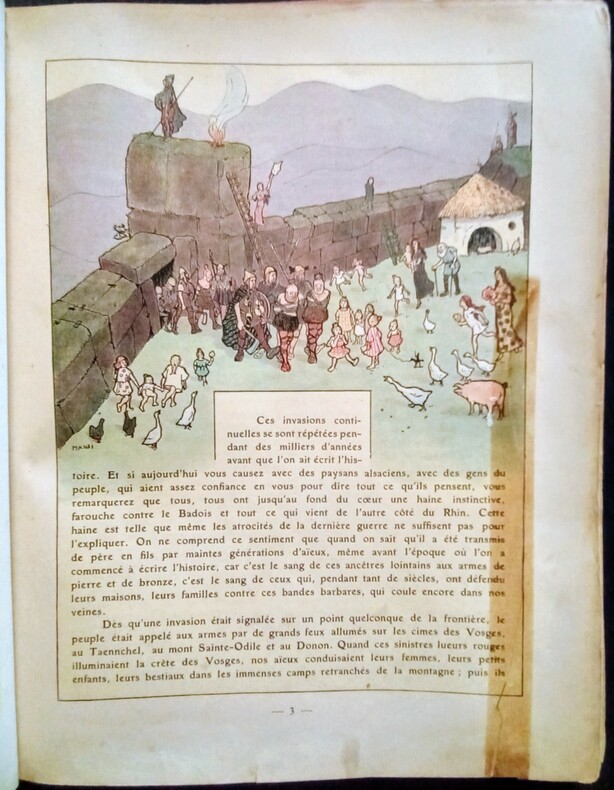 H. Floury, Editeur Paris 1915 In-folio ( 355 X 280 mm ) de 100 pages, cartonnage de percaline bleu, plats illustrés de décors polychromes, toutes tranches brique. Illustrations en couleurs dans et hors-texte à pleine page, par HANSI et HUEN. Usures aux niveau des coiffes, dos légèrement "ombré", gardes intérieures fendues avec première contregarde absente.