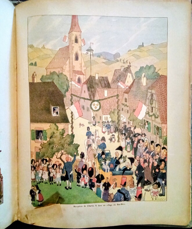 H. Floury, Editeur Paris 1913 In-folio ( 355 X 280 mm ) de 100 pages, cartonnage de percaline bleu, plats illustrés de décors polychromes, toutes tranches brique. Illustrations en couleurs dans et hors-texte à pleine page, par HANSI et HUEN. Dos légèrement "ombré", très bel exemplaire.