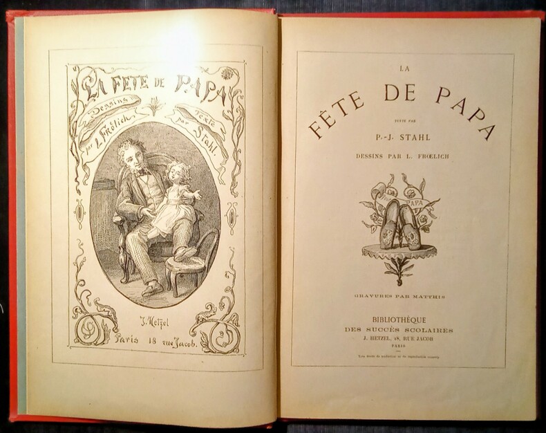 Texte par P.-J. Stahl. Dessins par L. Froelich. Gravures par Matthis. Paris, Bibliothèque des Succès Scolaires, J. Hetzel & Cie, sans date (vers 1888). Petit in-4 (28,5x19cm) percaline éditeur rouge par Engel Rel., orné de bouquets de fleurs, avec mention ''Prix'' et ''Bibliothèque des succès scolaires'', et 2ème plat au logos de H.J., petites fentes dans charnière vers la queue. 44 pages (22 de textes, 22 de gravures hors-texte + frontispice, titre.[Charnières intérieures faibles, et ouvrage sans rousseurs.]
