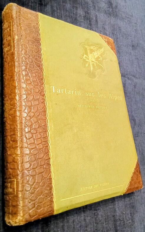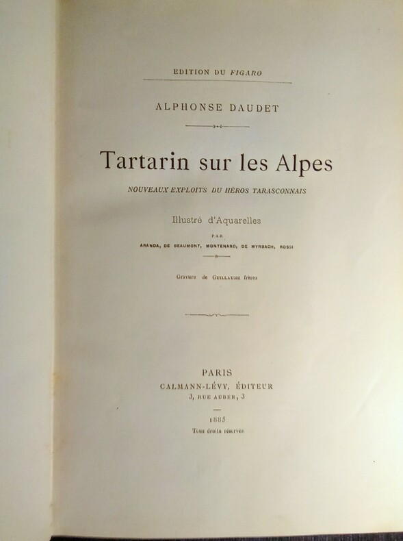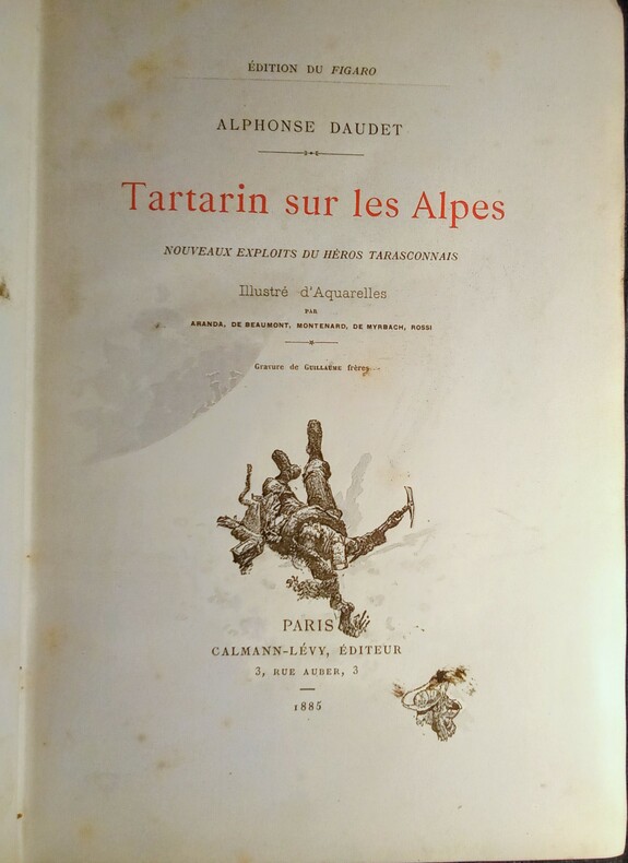 Paris Calmann-Lévy, "Edition du Figaro" 1885 1 vol. relié "Tartarin sur les Alpes. Nouveaux exploits du héros tarasconnais". In-8, demi-chagrin rouge, dos à nerfs, 334 pp. Edition originale illustrée de nombreuses aquarelles par Aranda, de Beaumont, Montenard, de Myrbach, Rossi d'après des gravures de Guillaume Frère. Bon exemplaire en reliure d'époque avec deux ex-libris gravés.