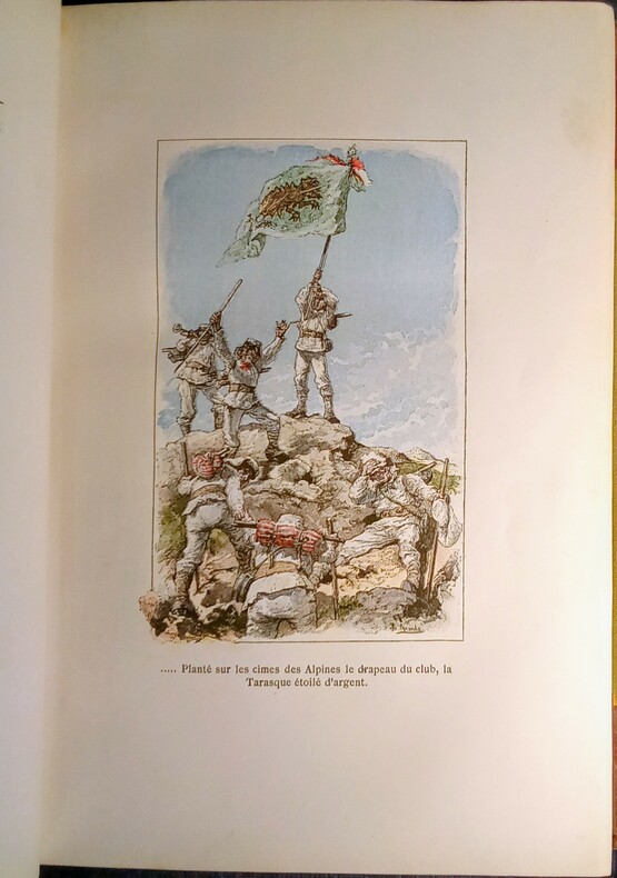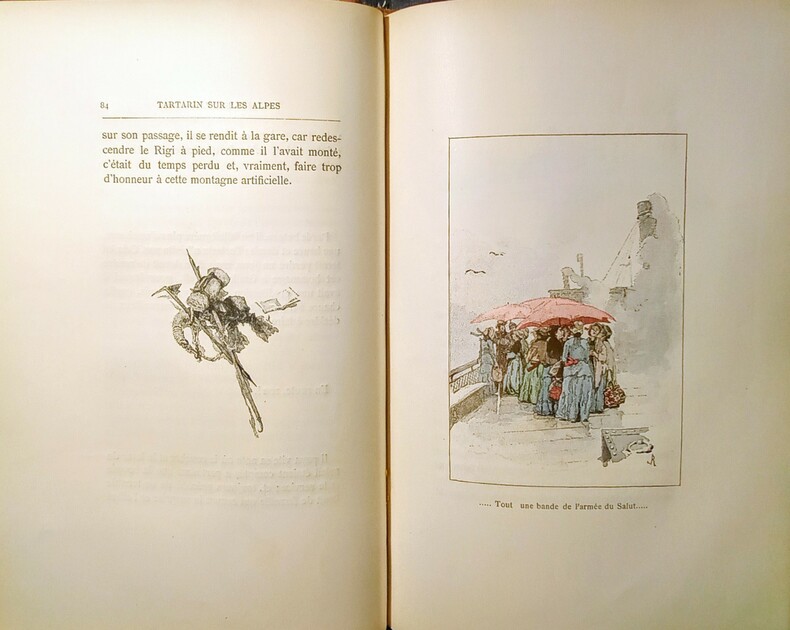 TARTARIN SUR LES ALPES Nouveaux exploits du héros Tarasconnais Nombreux dessins en noir et blanc et aquarelles en couleurs, dans le texte et hors-texte. Collection E. Guillaume et Cie. Dessins et Aquarelles de Aranda, de Beaumont, Montenard, de Myrbach, Rossi Gravures de Guillaume Frères. vol. in-4, 230x160, couverture éditeur, demi cuir à coins, gros grains, frottements, bel état intérieur, tranche de tête dorée, 334pp, couvertures d'origines conservées Paris Calmann Lévy 1885