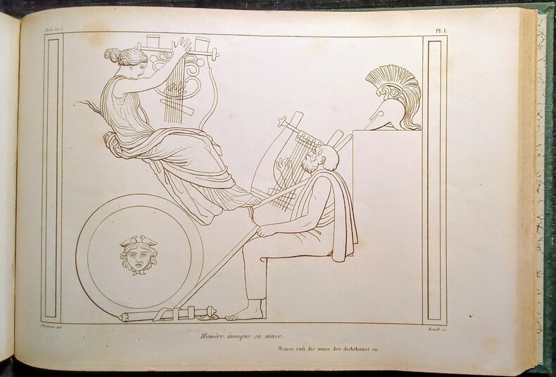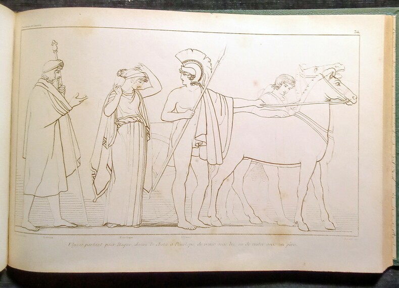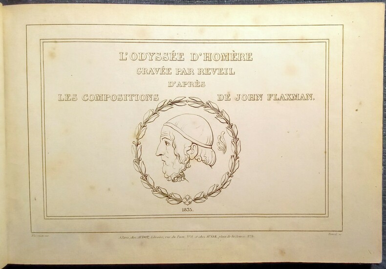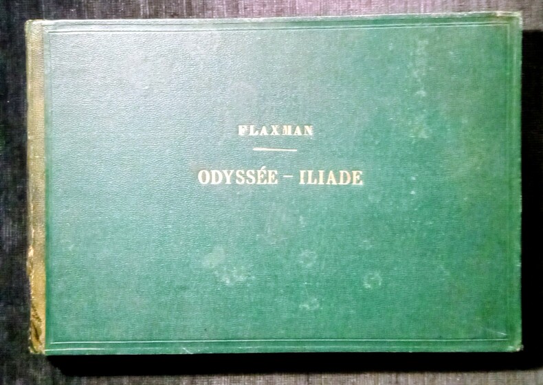 L'Odyssée d'Homère, gravée par Reveil d'après les Compositions de John Flaxman, 34 planches – L'Iliade d'Homère, gravé par Reveil d'après les Compositions de John Flaxman. 39 planches. Paris, Chez Audot & Chez Susse, 1835 (Odyssée) et Paris, publié par Reveil, 1833. 2 parties reliés en 1 volume in- 8 (16x2x23cm) oblong de demi chagrin noir, dos lisse à faux-nerfs, orné de fleurons, et petit manque de cuir au dos vers la coiffe inférieure, plats de cartonnage vert avec les légendes dorées sur le plat supérieur.