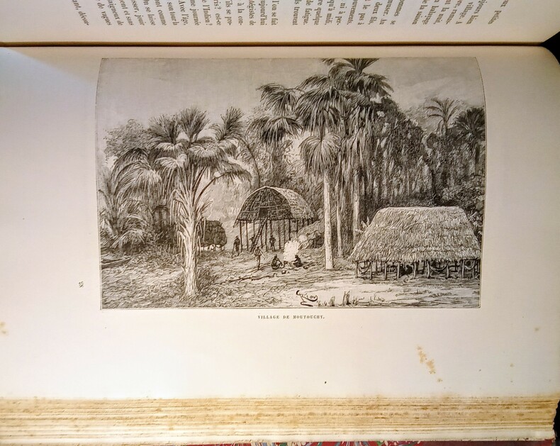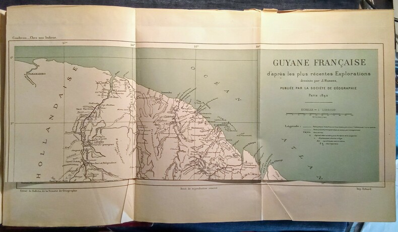 Ouvrage contenant 98 gravures in et hors texte sur bois et 1 carte grande carte dépliante en couleurs repliée(petite restauration sur la carte)la Guyane française d'après les plus récentes Explorations dessinée par J. Hansen, publiée par la Société de Géographie. Paris 1892. Paris, Librairie Hachette & Cie, 1893. In-4 (30x4,5x20cm)relié demi chagrin rouge à coins, dos à nerfs un peu passé avec 5 fleurons dorés et nom et titre dorés, tête dorée. III,614pp.