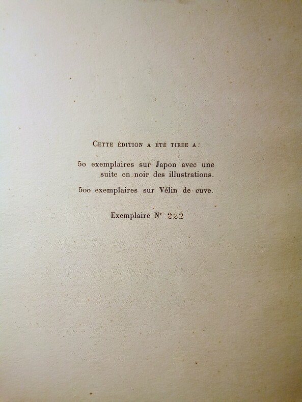 Première édition en volume, tirage à 550 exemplaires numérotés, celui-ci est un des 50 de tête sur Japon avec une suite en noir des illustrations (l'une d'elles est en réalité en sanguine). Préfaces de l'éditeur-relieur et de Henri Clouzot. Très bon état