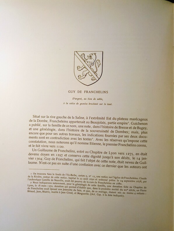 Lyon, Grange, 1908 fort in-4, XXIX-578 pp., nbx blasons in-t., index, broché. Petit manque à la couv.