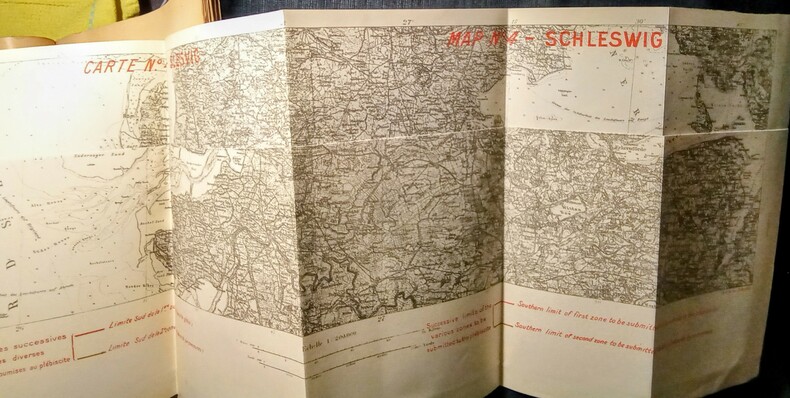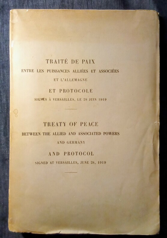Treaty of Peace Between the Allied and Associated Powers and Germany and Protocol Signed at Versailles, june 28, 1919. Paris, (Imprimerie Nationale)1919 in-folio (33,5x2,5x23cm) broché, couverture imprimée. VII-215pp, avec 4 pages de Protocoles, 33 pages Table Analytiques et 4 très grandes cartes dépliantes hors-texte en couleurs et noir et blanc. Texte en français et traduction anglaise en regard.