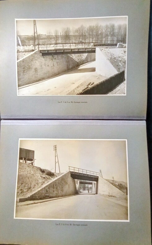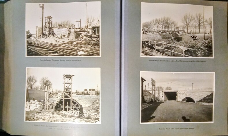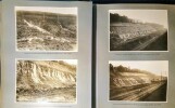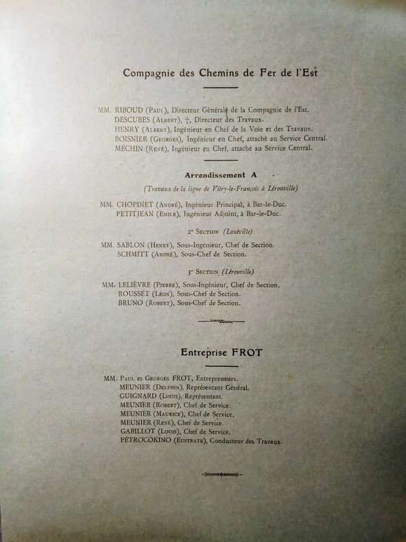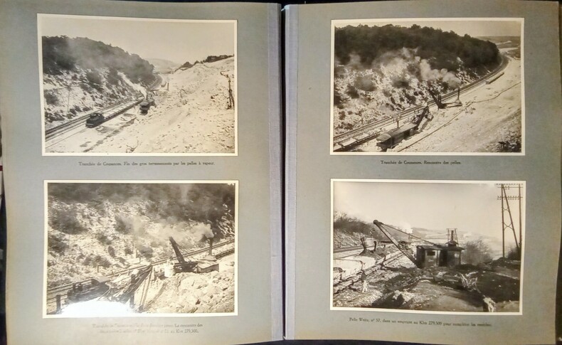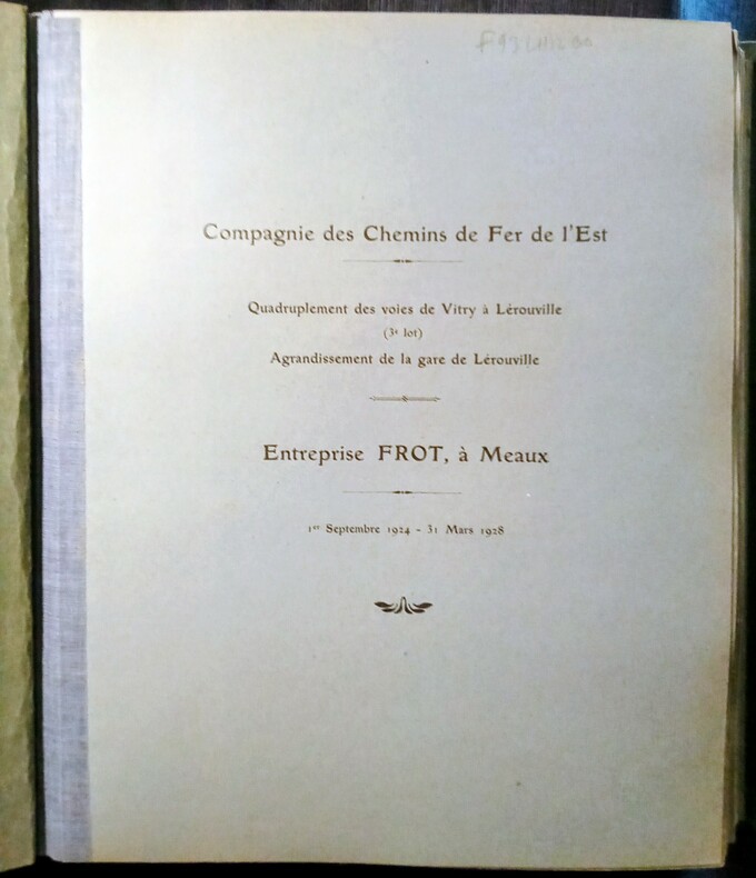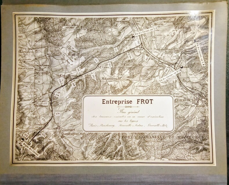 Quadruplement des voies de Vitry à Lérouville (3e lot). Agrandissement de la gare de Lérouville – Entreprise FROT, à Meaux. - 1er Septembre 1924 – 31 Mars 1928. [Album grand in-4 (33,5x5,5x28,5cm) percaline noire de 4 kg qui contient une Carte: Entreprise Frot: Plan général des travaux exécutés ou en cours d'exécution sur les lignes Paris – Strasbourg. Lerouville – Sedan. Lerouville – Metz, et 140 photographies qui montrent le cheminement des travaux. Contient une liste des noms de la Compagnie des Chemins de Fer de l'Est. Arrondissement A. (Travaux de la ligne de Vitry-Les-François). 2 ème Section (Loxéville). 3 ème Section (Lérouville) – Entreprise Frot (Noms). Bon état et dos et plat muets.