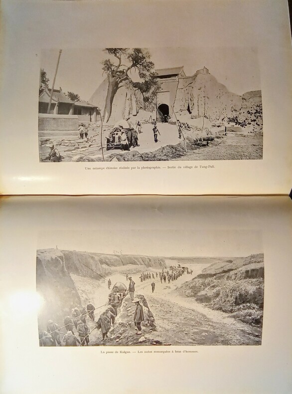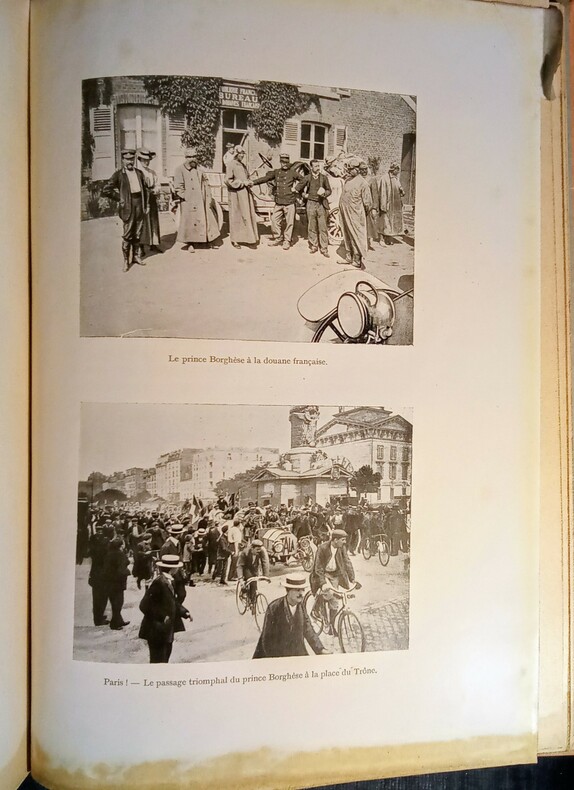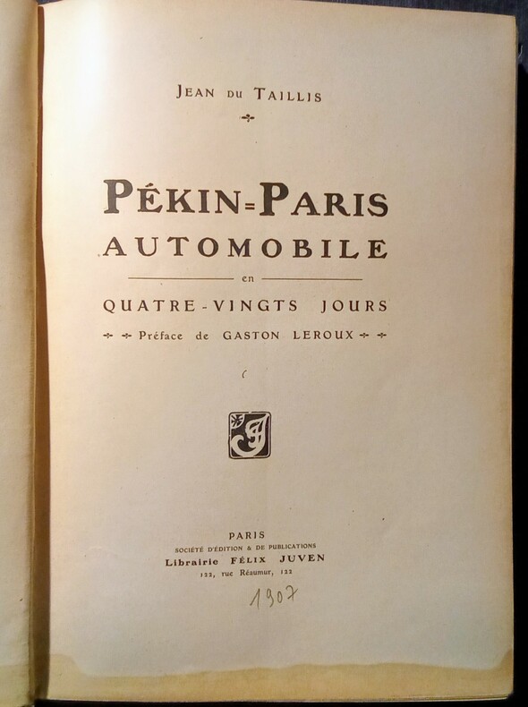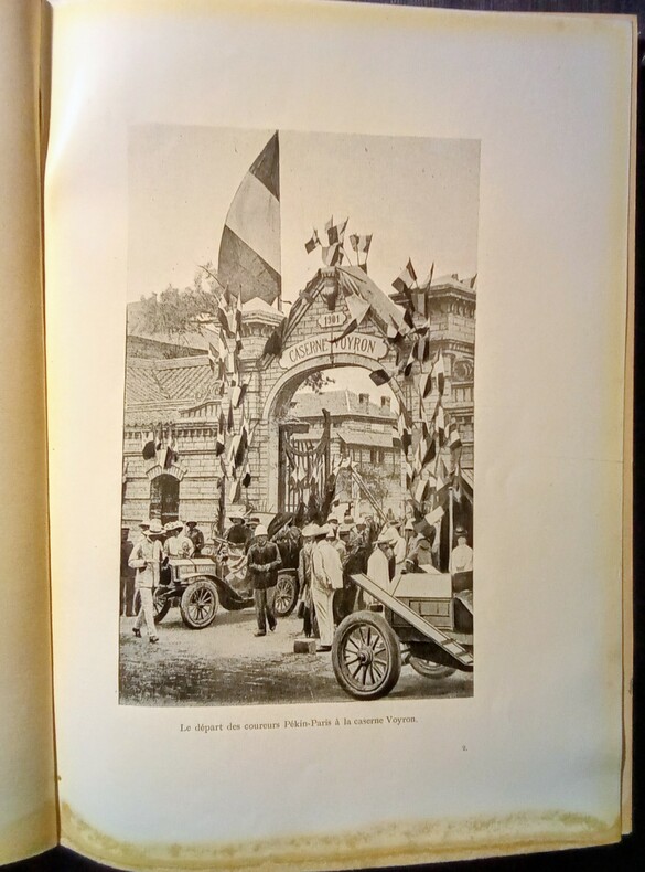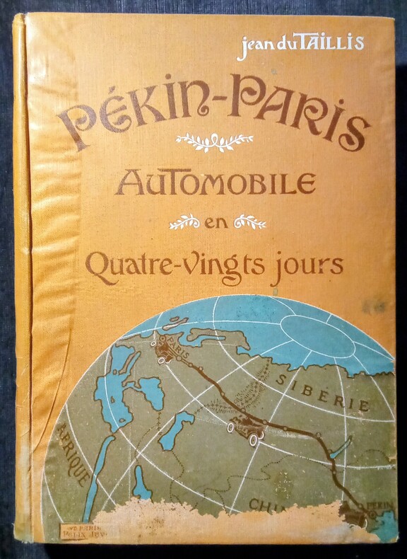 Préface de Gaston Leroux. Nombreuses illustrations hors texte. Paris, Librairie Félix Juven, 1907. In-4 (31x4,5x22cm) cartonnage éditeur orange orné d'une mappemonde du trajet Pékin - Paris, légendes en bordeaux et blanc, sur le plat supérieur, plat inférieur avec un écusson bordeaux et dos légèrement passé, décoloration sur le plat inférieur et trace de mouillure sur toutes les pages dans les marges inférieures, tête dorée. 319pp.