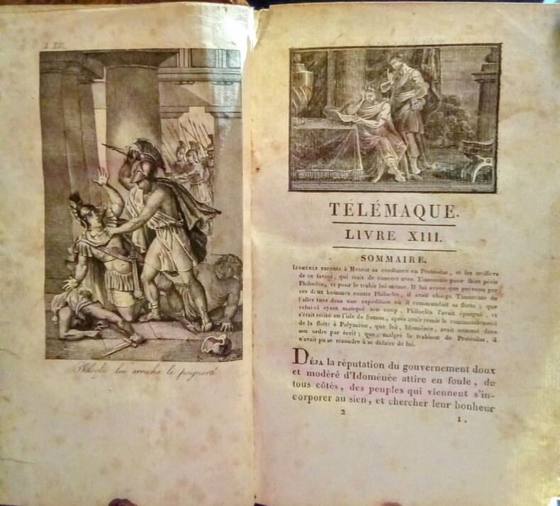 Fénelon (1651-1715) , le Cygne de Cambrai, est considéré aujourd’hui, avec “Les Aventures de Télémaque” comme un précurseur du siècle des Lumières. Précepteur du duc de Bourgogne, archevêque de Cambrai (1695-1715), il s'opposa à Bossuet et tomba en disgrâce lors de la querelle du quiétisme, et surtout, après la publication de son roman, Les Aventures de Télémaque (1699), considéré comme une critique de la politique de Louis XIV. L'influence littéraire de ce roman fut considérable pendant plus de deux siècles. Les Aventures de Télémaque sont à la fois une épopée et un traité de morale et de politique. Ce roman de 1699 connaît un grand succès jusqu'à la Première guerre mondiale (Aragon et Sartre l'avaient lu dans leur jeunesse). Les “Aventures de Télémaque” furent publiées en 1699 sans l'accord de l'auteur, et réimprimées en 1717 par les soins de sa famille. L'ouvrage a connu une foule d'éditions, a été traduit dans toutes les langues et a même été mis en vers latins (une première fois à Berlin en 1743, une seconde fois à Paris, par Étienne Viel en 1808). Ce roman a provoqué la disgrâce de Fénelon à la cour. Ce dernier avait écrit ce roman d'aventures à l'attention des élèves royaux et en particulier du duc de Bourgogne, le fils du dauphin, dont il était le précepteur. Peintre et dessinateur prolifique, Charles Monnet (1732-1808) est l'un des plus célèbres illustrateurs de la fin du XVIIIe siècle. Bon état d’occasion