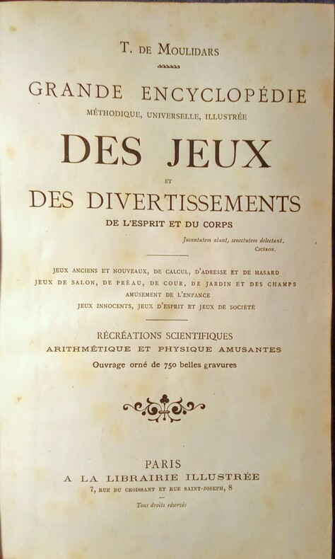 Ouvrage orné de 750 belles gravures, 1 vol. in-8 cartonnage vert éditeur, A la Librairie Illustrée, Paris, s.d. [ circa 1910 ], 796 pp. Rappel complet du titre : Grande Encyclopédie méthodique, universelle, illustrée des Jeux et Divertissements de l'Esprit et du Corps. Jeux anciens et nouveaux, de calcul, d'adresse et de hasard, jeux de salon, de préau, de cour, de jardin et de champs, amusement de l'enfance, jeux innocents, jeux d'esprit et de société. Récréations scientifiques, arithmétique et physique amusantes.