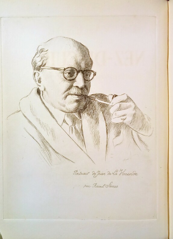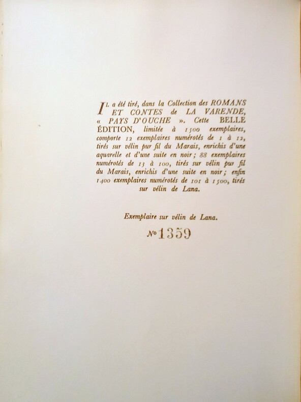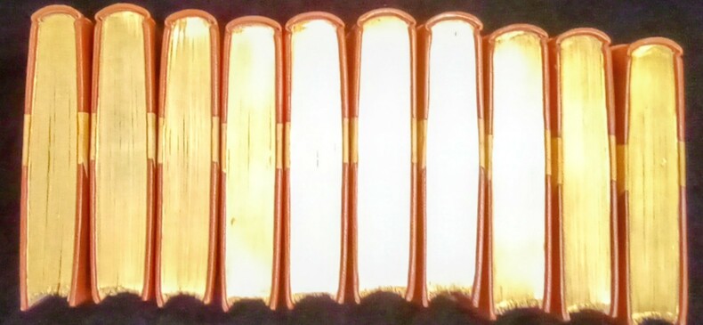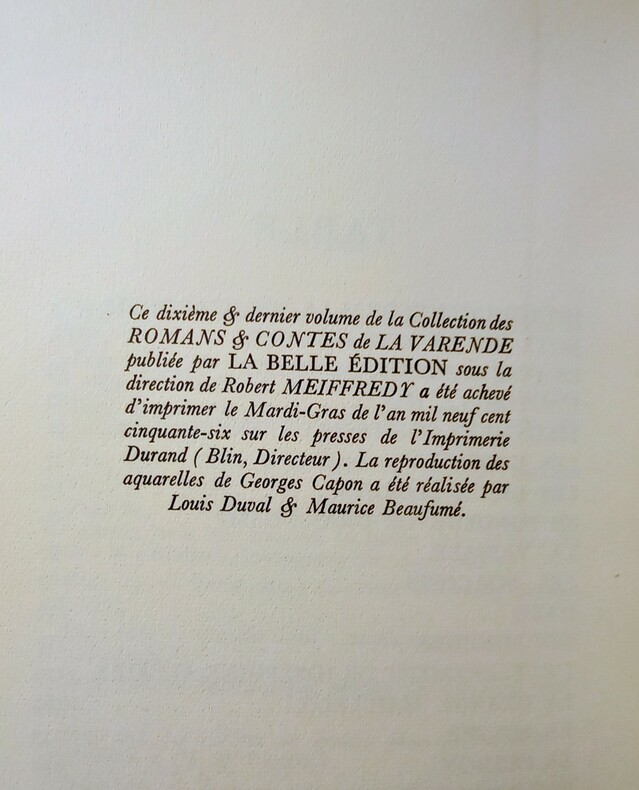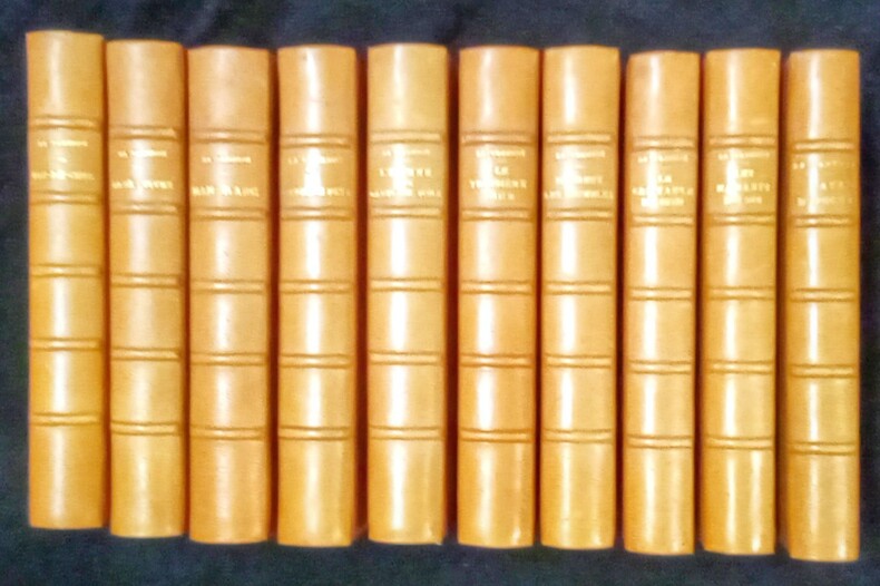 Nez-de-Cuir. Gentilhomme d'Amour. Illustrations de Paul Jarach. Portrait gravé par Raoul Serres. - Eaux Vives. Aquarelles de Raoul Serres. - Man' D'Arc. Compositions de G. De Sainte-Croix. - La Dernière Fête. Illustrations de G. De Sainte-Croix. - L'Homme aux Gants de Toile. Aquarelles d'André Roux. - Le Troisième Jour. Compositions de G. De Sainte-Croix. - Heureux Les Humbles. Suite Romanesque. Illustrations de Pierre Noël. - Le Centaure de Dieu. Gravures de Pierre Leroy. - Les Manants du Roi 1793-1950. Illustrations de Raoul Serres. - Pays d'Ouche 1740-1933. Illustrations de Georges Capon (Ce dixième & dernier volume de la Collection des ROMANS & CONTES de LA VARENDE). Paris, La Belle Édition, 1956. 10 volumes in-8 (21,5x3x16cm) reliés demi chagrin marron à coins, dos à 5 nerfs, nom et titres dorés, têtes dorées, couvertures en couleurs et dos conservés. 265pp. + 205pp. + 305pp. + 287pp. + 324pp. + 281pp. + 271pp. + 268pp. + 231pp. + 211pp.
