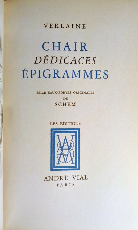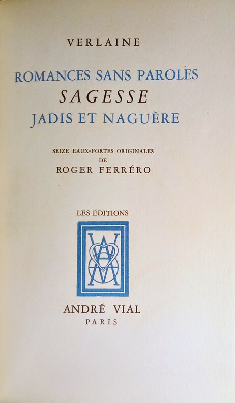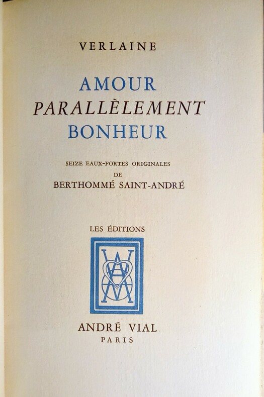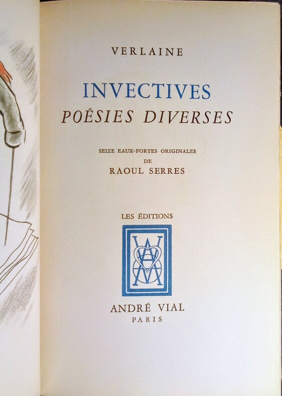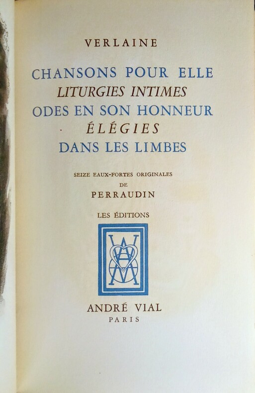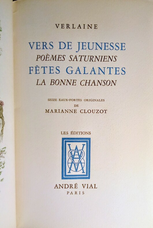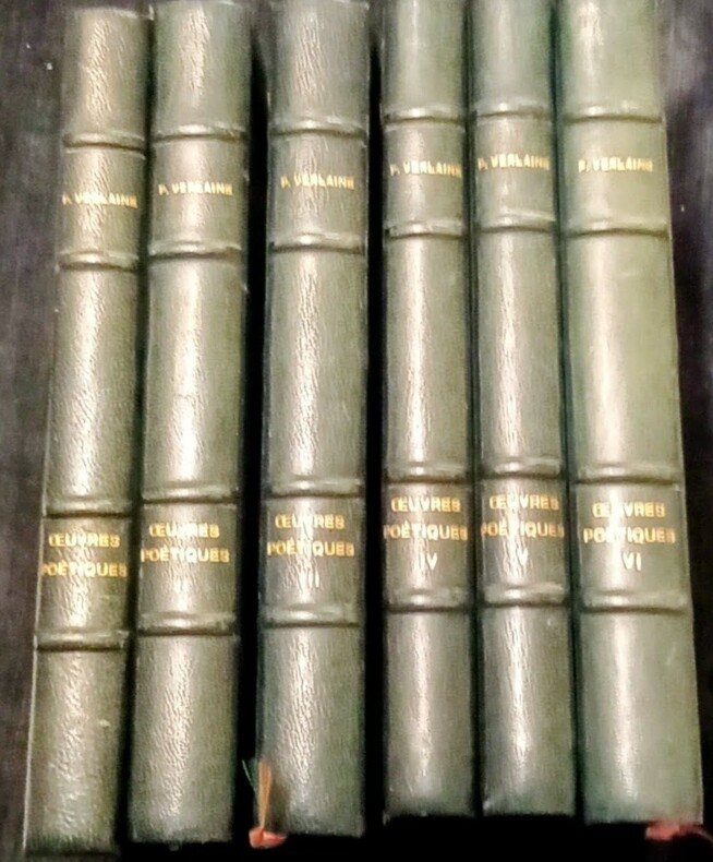 I: Vers de Jeunesse. Poèmes Saturniens. Fêtes Galantes. La Bonne Chanson. 16 eaux-fortes originales de Marianne Clouzot. II: Romances sans Paroles. Sagesse. Jadis et Naguère. 16 eaux-fortes originales de Roger Ferréro. III: Amour. Parallèlement. Bonheur. 16 eaux-fortes originales de Berthommé Saint-André. IV: Chansons pour Elle. Liturgies Intimes. Odes en Son Honneur. Élégies. Dans Les Limbes. 16 eaux-fortes originales de Perraudin. V: Chair. Dédicaces. Épigrammes. 16 eaux-fortes originales de Schem. VI: Invectives. Poésies Diverses. 16 eaux-fortes originales de Raoul Serres. Paris, Les Édition André Vial, 1948. 6 volumes in-8 (23x3x14cm) reliés demi chagrin noir à coins, dos à 4 nerf, nom et titre dorés, couvertures et dos conservés, têtes dorées. 172pp. + 216pp. + 220pp. + 169pp. + 177pp. + 235pp.
