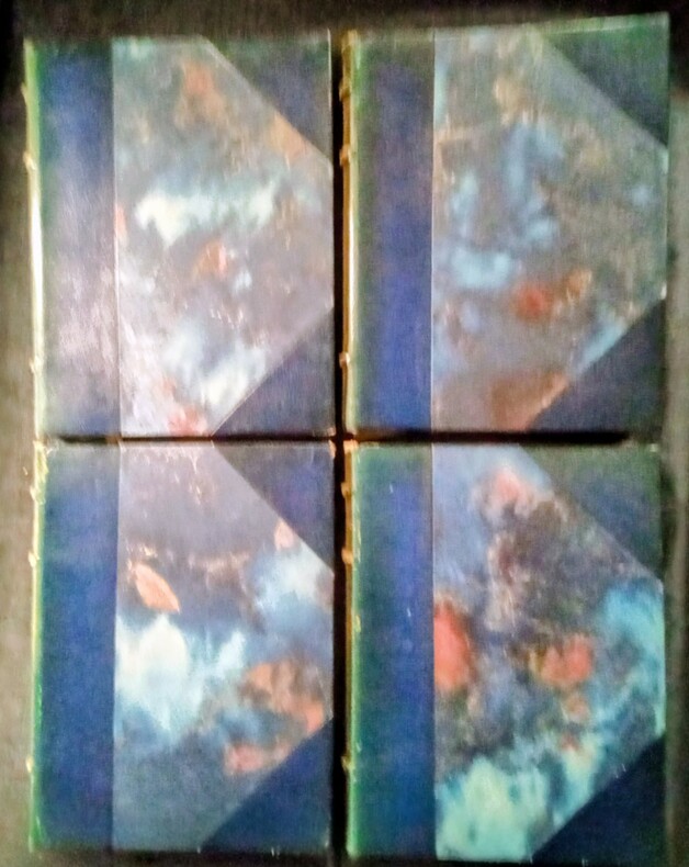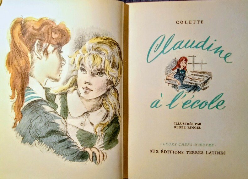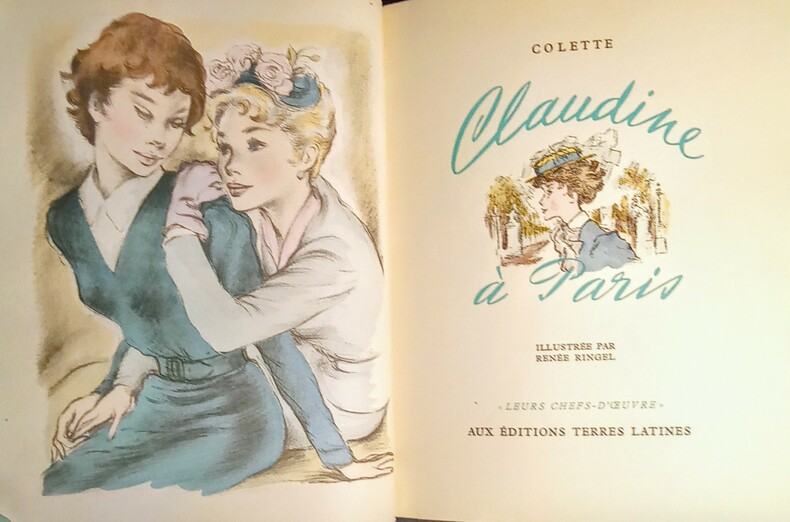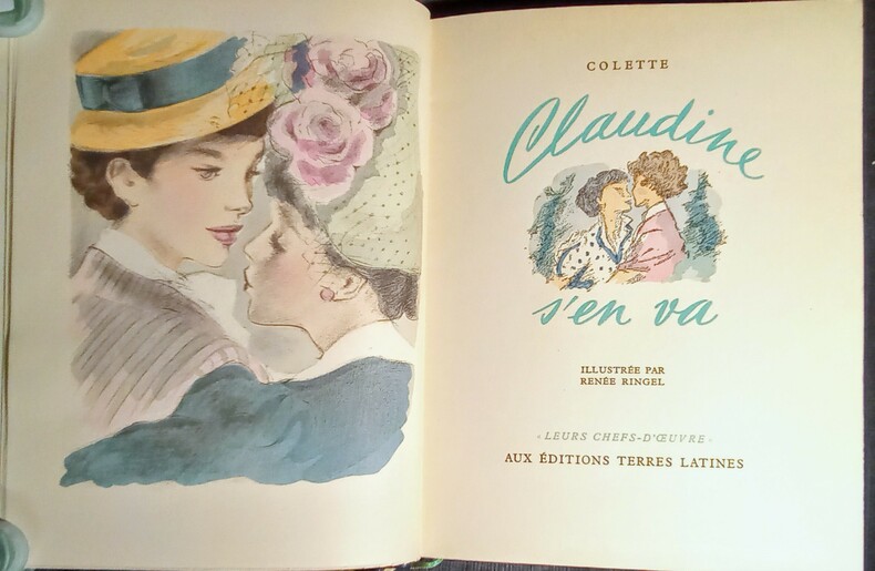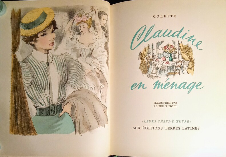 I: Claudine à l'école. II: Claudine à Paris. III: Claudine en ménage. IV: Claudine s'en va. Illustrations en couleurs hors-texte et dans le texte par Renée Ringel. Bruxelles, Aux Éditions Terres Latines, sans date (vers 1950). 4 volumes in-8 carré (21x18cm) reliés demi chagrin vert foncé à coins, dos à 3 nerfs, avec le Claudine doré reparti sur les quatre volumes, couvertures et dos conservés, têtes dorées. 207pp. + 154pp. + 151pp. + 129pp.