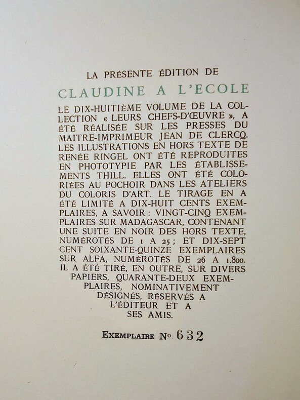Collection «Leurs Chefs-d'Oeuvre – Claudine» complète en 4 volumes. Tirage à 1800 exemplaires, celui-ci n°632/1700 sur Alfa. Quelques éraflures aux dos et légèrement passés.