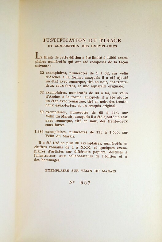 Très belle reliure et en bon état. Tirage à 1500 exemplaires, celui-ci n°657/1386 sur Vélin du Marais.
