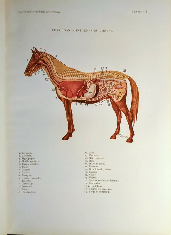 Préface de Monsieur le Professeur André-M. LEROY. Les Bovins – Le Cheval – Le Mulet – Le Porc – Le Mouton – La Chèvre – La Basse-Cour – Le Chien – Le Chat. 694 illustrations en noir et 20 hors-texte couleurs. Publiée par Jacques Kramer, éditeur. Traité précis et complet établi par: Th. Camenzind – F. Andrist – P. Charlet – Hubert Chavannes – Dr. M. Leuthold. Paris, Comptoir Français du Livre & Monte-Carlo, édition du Livre, 1952. In-4 (27x4x19cm) cartonnage vert éditeur, titre frappé sur le plat supérieur et au dos en dorés.XXVIII,842pp.