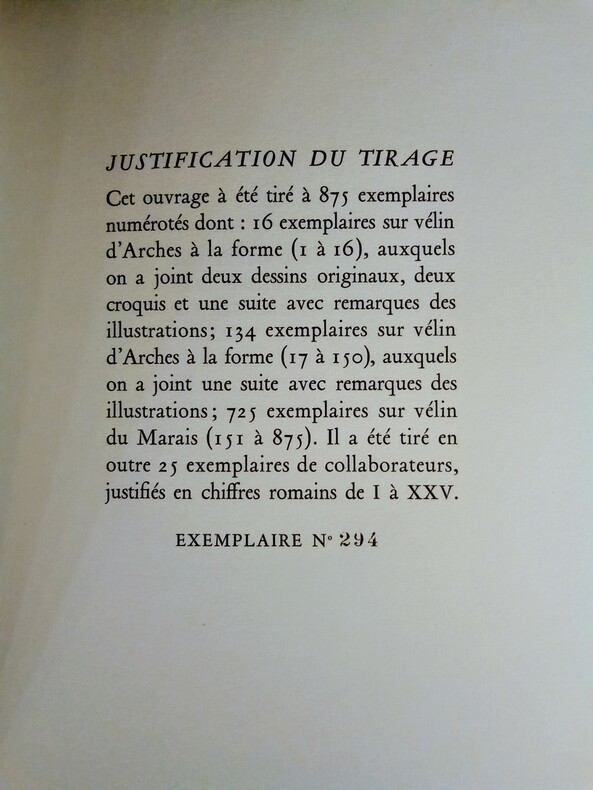 Complet en 2 volumes et tirage à 875 exemplaires, dont 725 exemplaires sur Vélin du Marais n°294/725. Très bon état.