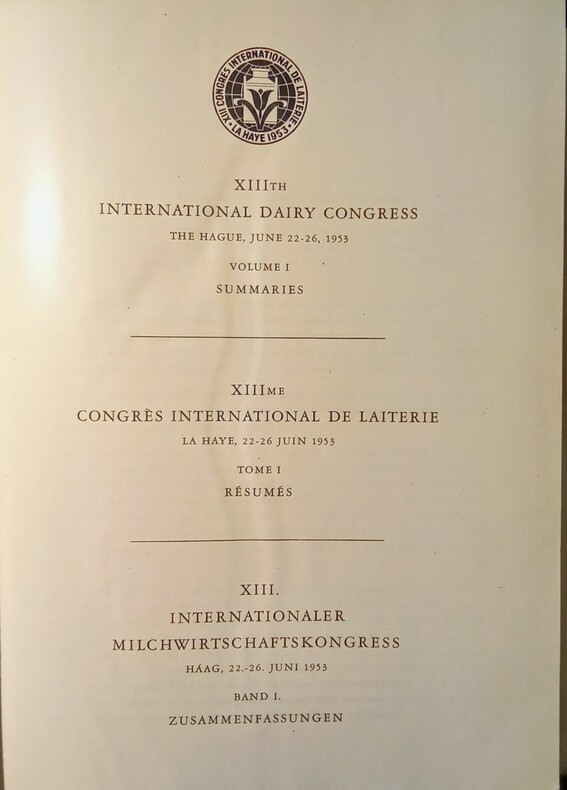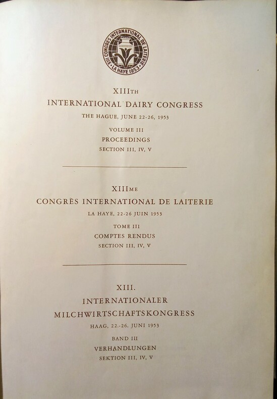 Ouvrage en 3 langues: XIIIth. International Dairy Congress. The Hague, June 22-1953 – XIIIme Congrès International de Laiterie La Haye, 22-26 juin 1953 – XIII. Internationaler Milchwirtschaftskongress Haag, 22-26 juni 1953. Rare.