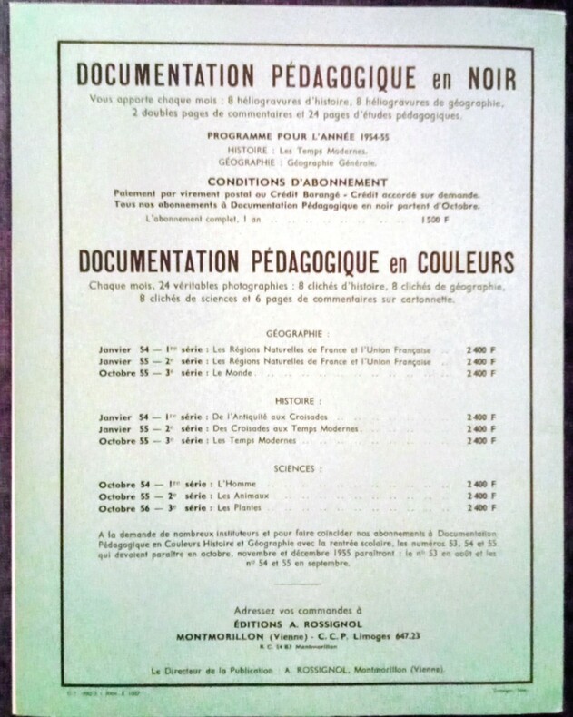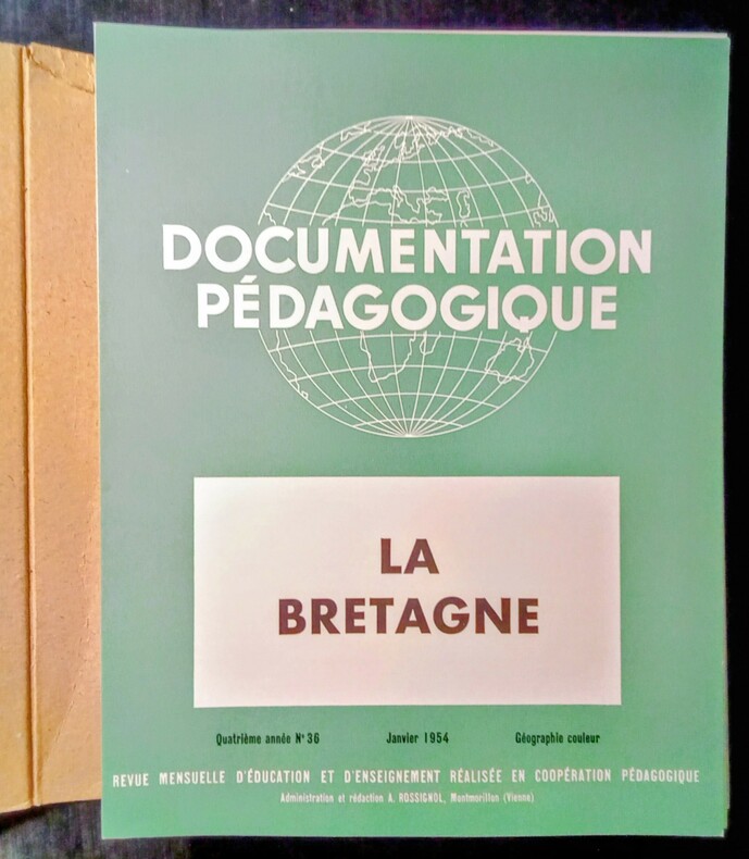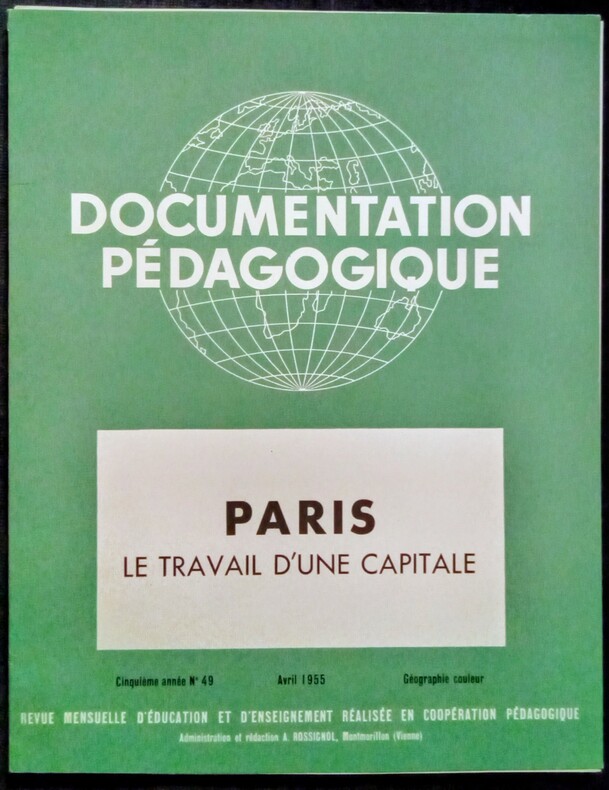 Documentation Pédagogique – 4 ème Année N°36 janvier 1954: La Bretagne - La Normandie - Les Alpes - Les Pyrénées - Le Massif Central - Le Bassin Aquitain – Le Midi Méditerranéen – L'Est – Jura & Pays de la Saone – La Région du Nord – L'Est du Bassin Parisien – Les Pays de la Loire – Paris, L'Air d'une Capitale, à la 5 ème Année N°49 avril 1955 – Paris, Le Travail d'une Capitale. Montmorillon, Revue Mensuelle d'Éducation et d'Enseignement. Réalisation en Coopération Pédagogique, Administration et Rédaction A. Rossignol, 1954-1955. 14 pochettes in-4 (27,5x21cm) de 7 planches de Géographie couleur en moyenne dans les 14 pochettes des Régions, avec une chemise et étui de plat orné d'une vue de Paris.