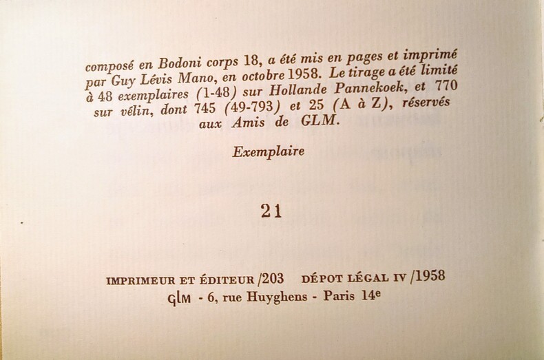 Paris, G.L.M., [octobre 1958]. In-32 oblong (9,2x13,5), 48pages (32 numérotées et 8 feuilles non numérotés). Couverture ocre.