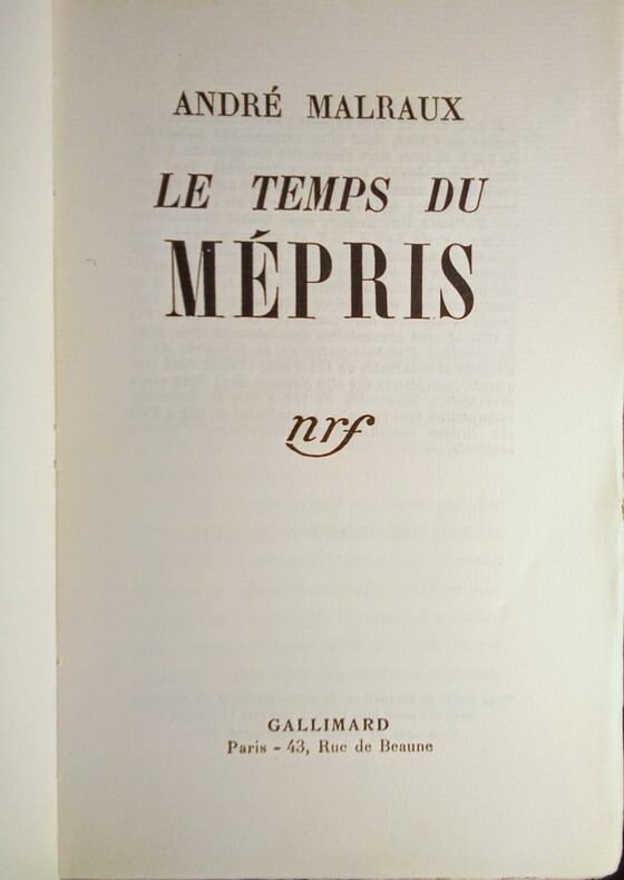 Editions Gallimard 1935 1935. Andre Malraux: Le Temps Du Mépris/ Gallimard 1935