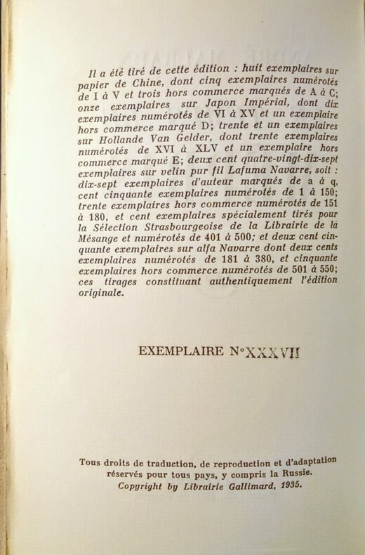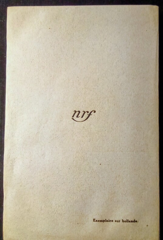 Paris, Gallimard, (15 mai) 1935. 1 vol. (120 x 185 mm) de 184 p. et [2] f. Broché. Édition originale. Un des 31 exemplaires sur hollande (n° XLV).