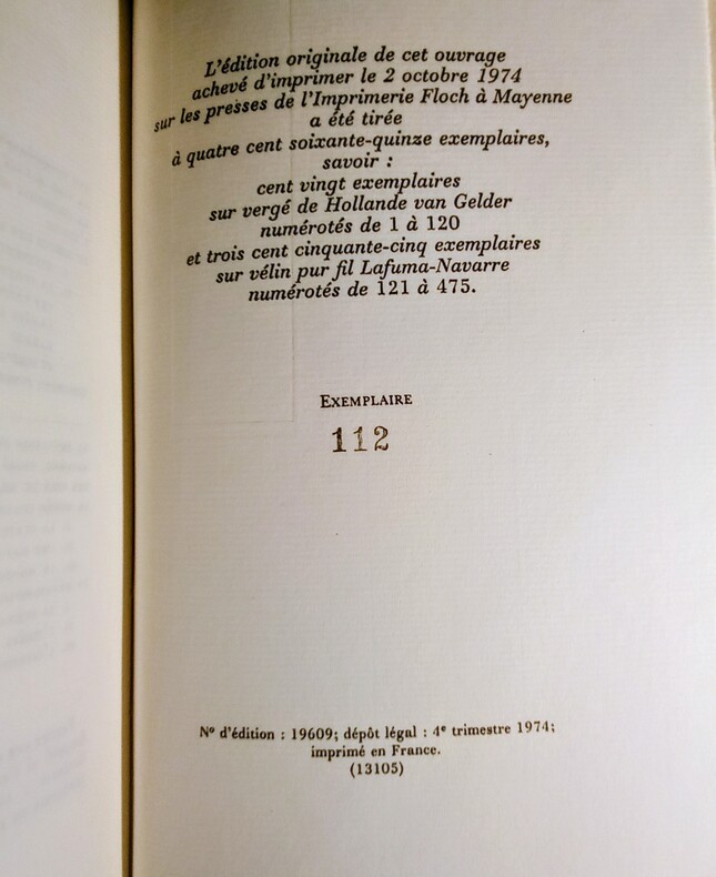 Édition originale, tirage à 475 exemplaires, celui-ci 1/120 exemplaires sur vergé de Hollande van Gelder, ici n°112/120. Exemplaire non coupé et bon état.