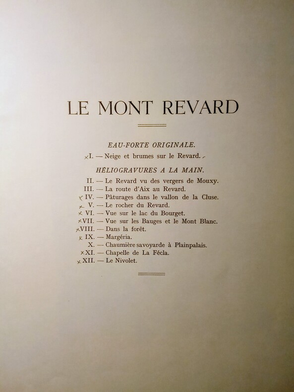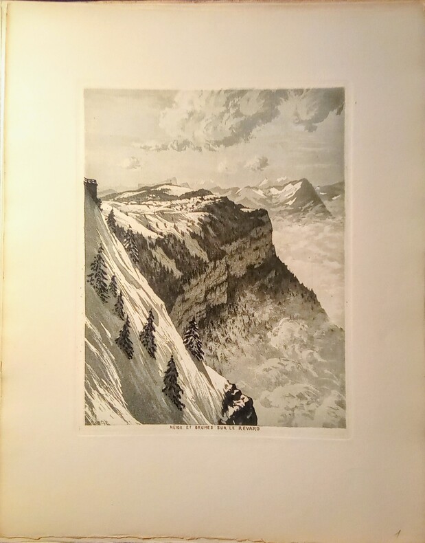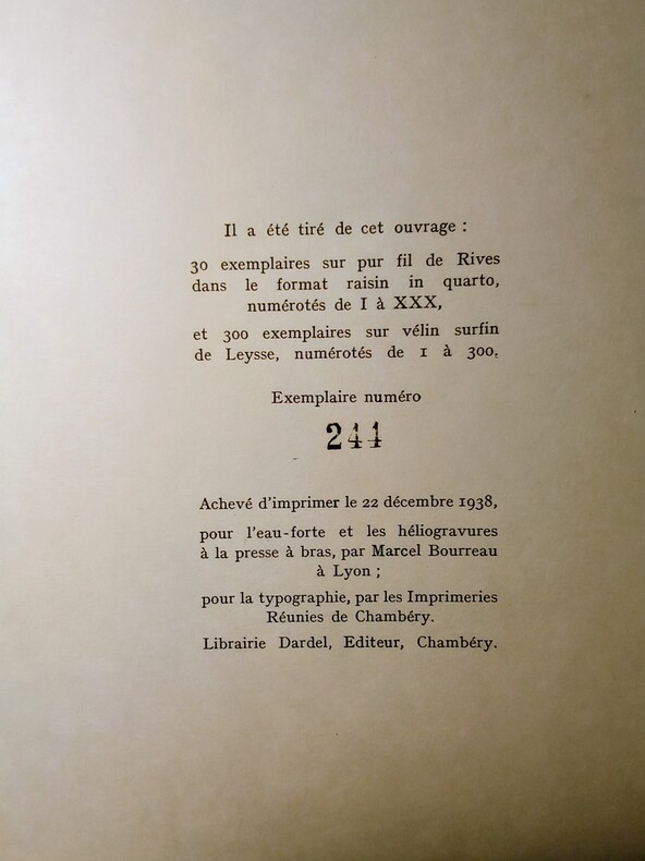 Tirage à 330 exemplaires, celui-ci n°244/300 sur vélin surfin de Leysse et complet de l'eau-forte originale (Neige et brumes sur le Revard), mais manque 3 héliogravures à la main, un rajout d'une eau-forte (Grenoble 1933) de format différent.