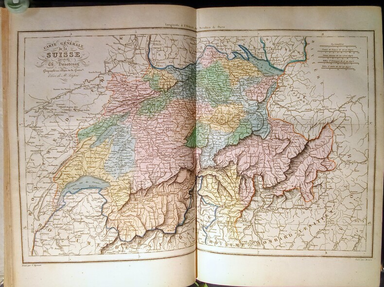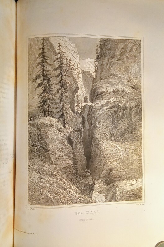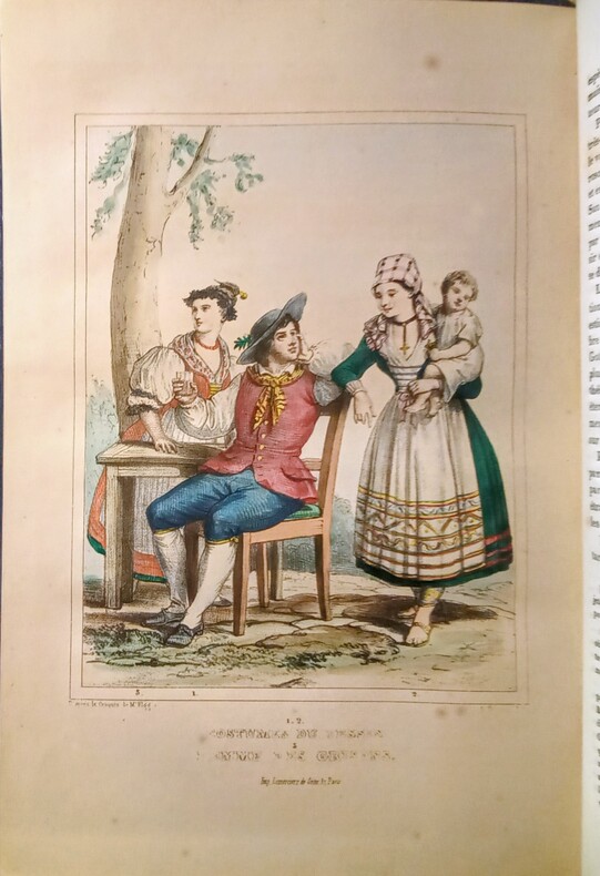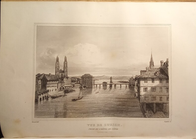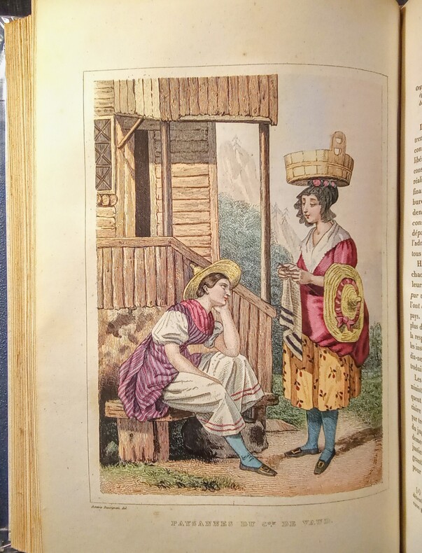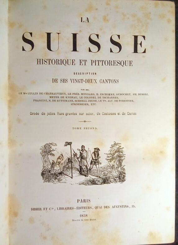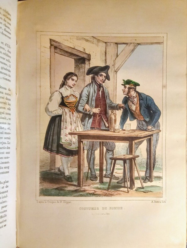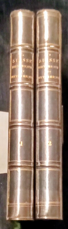 Contient: Précis de l'histoire de la Suisse: partie pittoresque dans la première volume. Le deuxième volume pittoresque, avec les vues gravées de Zürich, Berne, Fribourg, Altorf, Lausanne et Lugano, les costumes militaires, de Lucern, d'Unterwald, de Schaffhouse et du Tessin en couleurs. / Aussi les contrées voisines de la Suisse (Jura français, Alsace, Valteline (avec illustrations ‘Roche et Porte d'Hannibal’) Savoie etc.). Image disp.