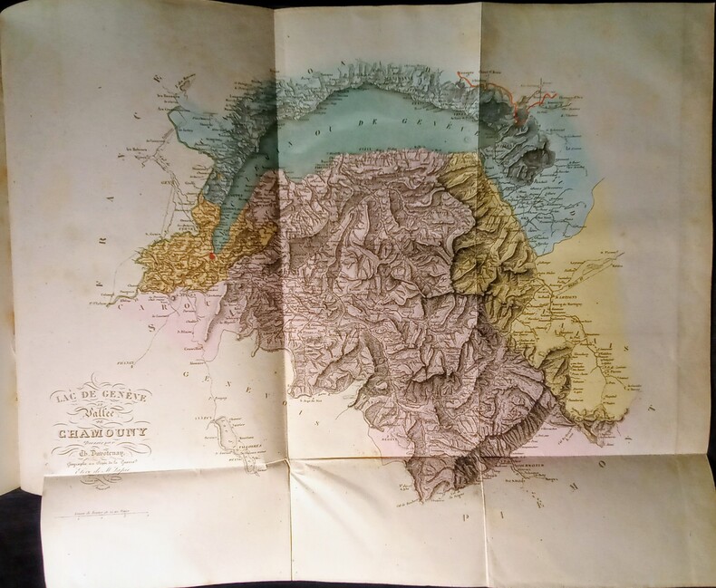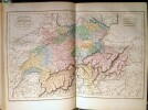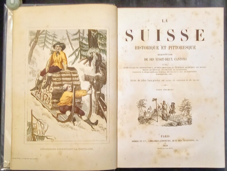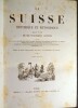 Description des ses vingt-deux cantons, par Le Mis Lullin de Chateauvieux, Le Prés. Monnard, H. Zschokke, Dubouchet, Ph. Busoni, Meyer de Knonau, Le Colonel de Tscharner, Francini, N. De Ruttimann, Schnell, Le Vte Alc. De Forestier, Strohmeier, etc. Ornée de jolies Vues gravées sur acier, de Costumes et de Cartes. 71 vues hors-texte gravées sur acier, 19 planches de costumes hors-texte en couleurs , 1 tableau de conversion des monnaies, et 2 cartes dépliantes en couleurs (1 carte de vue d'ensemble de la Suisse à la page une du tome premier et une carte du Lac de Genève et la Vallée de Chamouny à la fin du tome deuxième). Paris, , Didier et Cie, Libraires-Éditeurs, 1858. 2 volumes in-4 (27,5x3,5x19cm) reliés demi chagrin noir, dos à 4 nerfs ornés de filet et de caissons et le titre dorés, tranches dorées. Faux titre, titre avec vignette, LVI,208pp. + Faux titre, titre avec vignette, 261pp.+errata.
