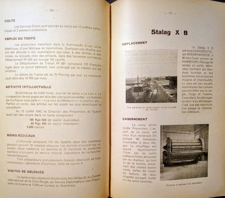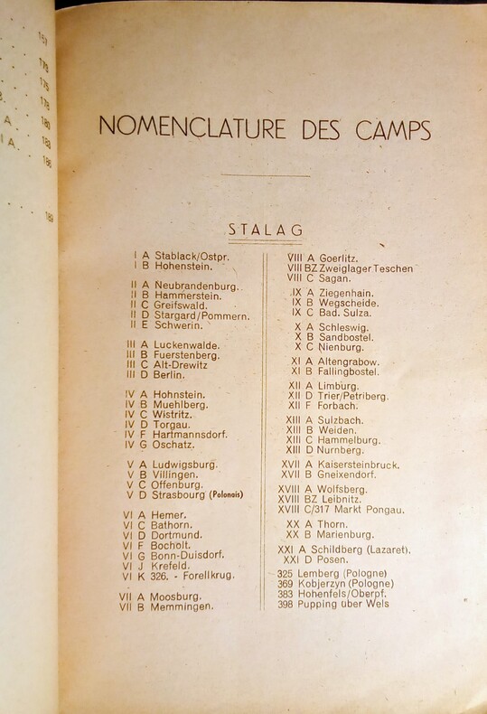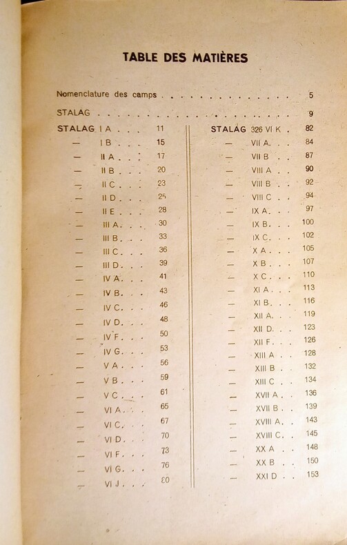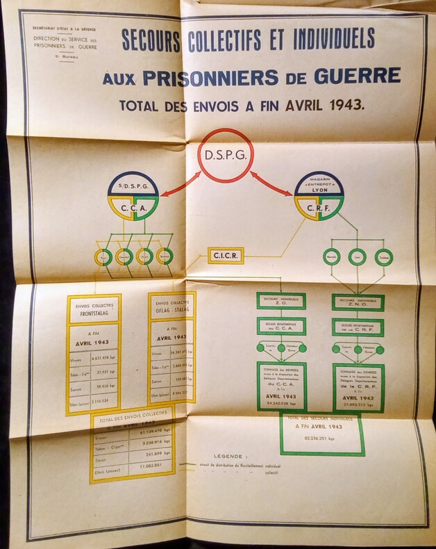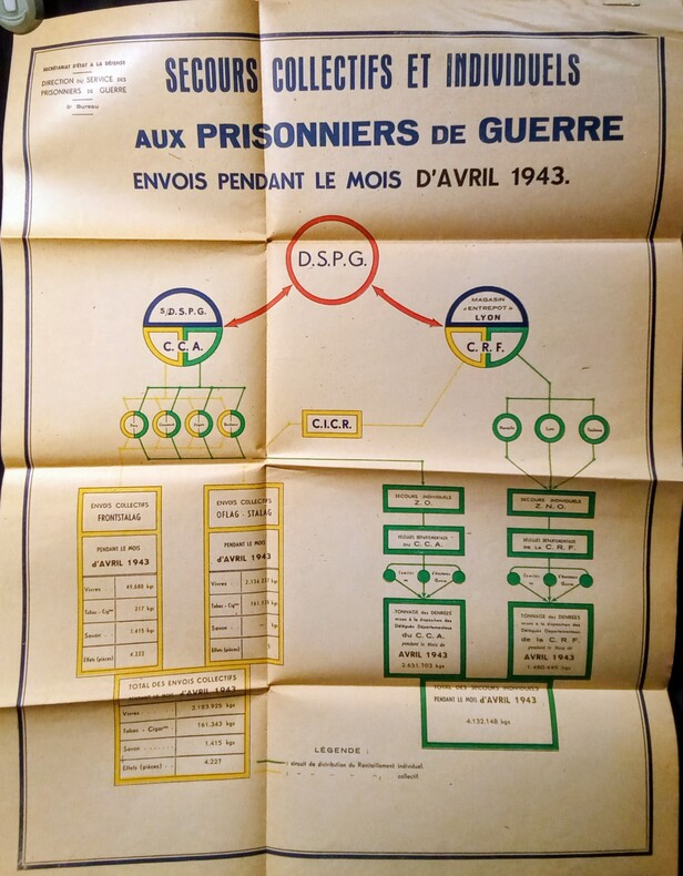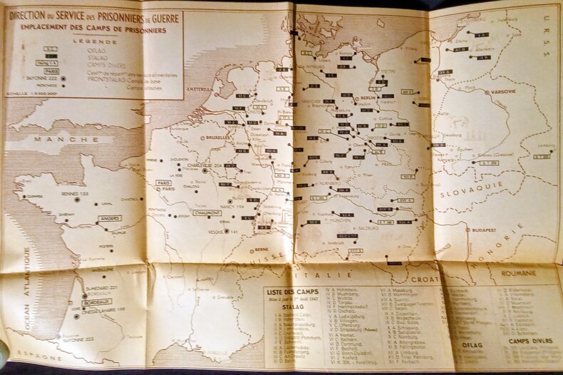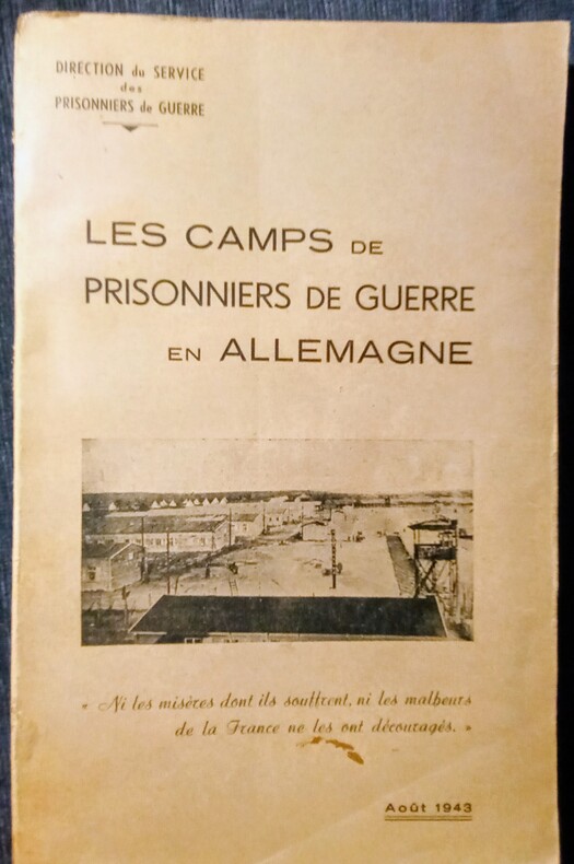 Avec une Nomenclature des Camps: STALAG à OFLAG, avec de nombreuses photographies des camps dans le texte et deux grandes cartes repliées en fin du volume (1- Secours collectifs et individuels aux prisonniers de guerre envois pendant le mois d'avril 1943. 2- Secours collectifs et individuels aux prisonniers de guerres total des envois à fin avril 1943). Direction du Service des Prisonniers de Guerre, Août 1943. In-8 (21,5x14cm) broché, couverture imprimée et ornée d'une photographie d'un camps. 189pp.