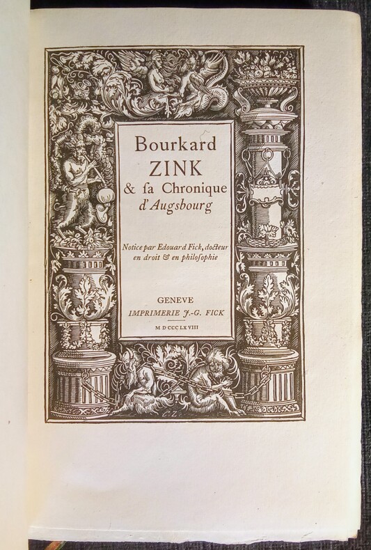 Notice par Edouard Fick, docteur en droit & en philosophie. Page de titre orné, tête de chapitre et lettrines ornées. Genève, J.-G. Fick, 1868. Petit in-8 (19x12cm) relié demi vélin blanc à coins, dos lisse avec les légendes en noir et rouge avec fleuron, tête rouge. 110pp.