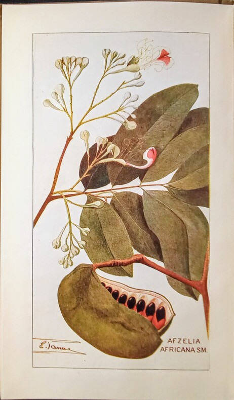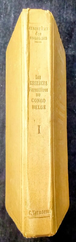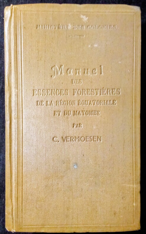 Les Essences forestières du Congo Belge. I-Manuel des Essences forestières de la région équatoriale et du Mayombe, par C. Vermoesen (Docteur en sciences naturelles. Conservateur au jardin botanique d'Etat. Ancien directeur du jardin botanique d'Eala (Congo Belge). Professeur à l'Université de Louvin. Planches coloriées et dessins par E. Lange (préparateur d'histoire naturelle), 30 planches en couleurs et 38 planches en noir et blanc. Bruxelles, Imprimerie Industrielle & Financière, 1931. In-8 (18,5x2x10cm) percaline éditeur. XII,282 [8]pp.