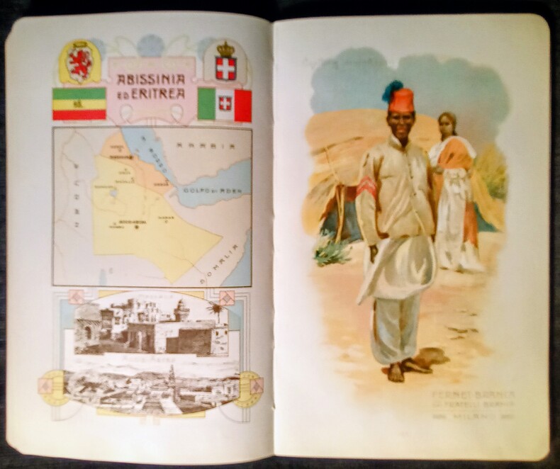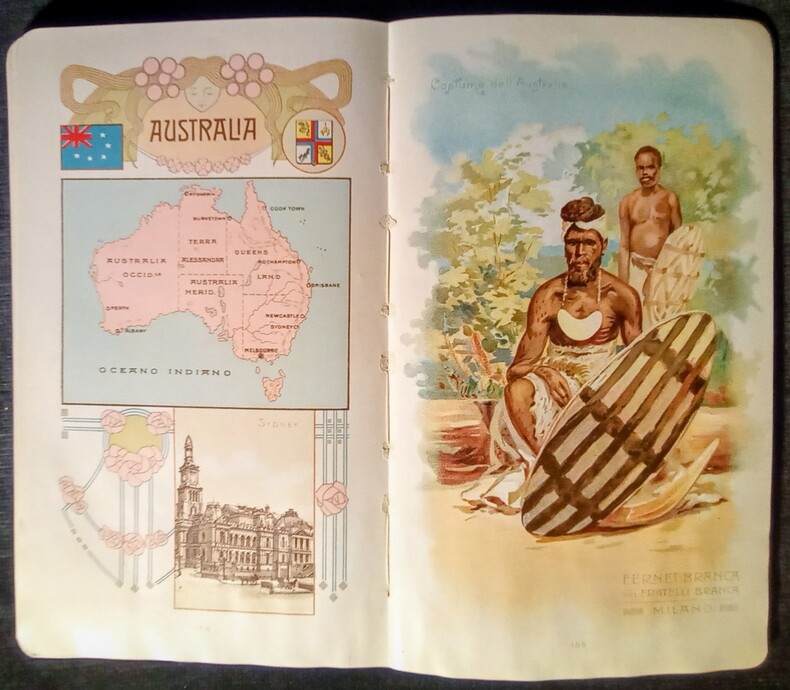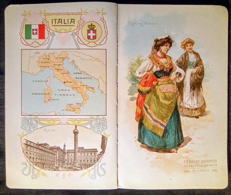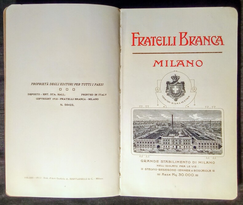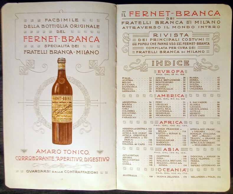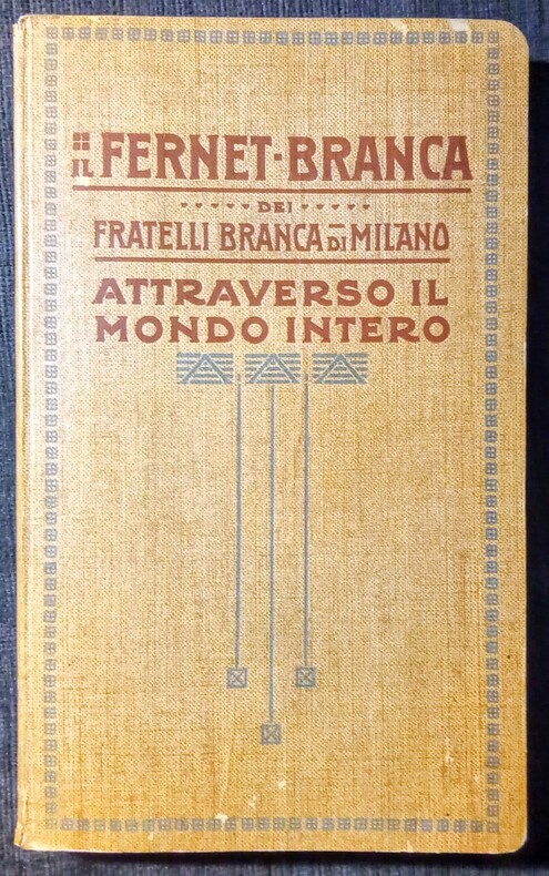 Il Fernet-Branca dei Fratelli Branca di Fratelli Branca di Milano. Attraverso il Mondo Intero – Rivista dei Principali Costumi de Popoli Che Fanno Uso del Fernet-Branca. Compilata Per Cura Dei – Fratelli Branca di Milano. Indice: Europa – America – Africa – Asia – Oceania. Milano, Copyright 1912 – Fratelli Branca & 1912 – Stab. D'Arti Grafiche A. Bertarelli & C. Milano. In-8 (19,5x1,5x12cm) percaline éditeur beige imprimé et décoré . 173pp.