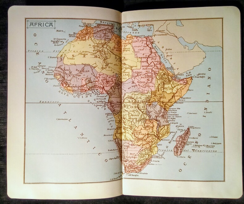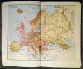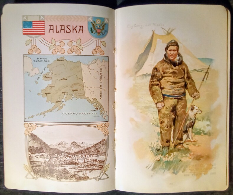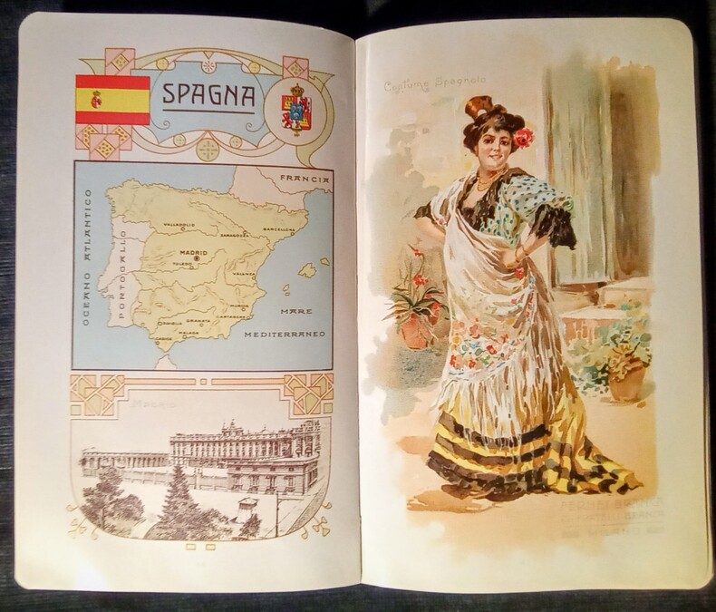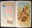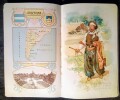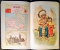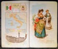 Catalogue de publication promotionnelle illustré de chromolithographie: 5 cartes du Monde en couleurs, 75 costumes traditionnels dans un environnement d'origine, Carte de chaque Pays, Drapeau et Armoirie. Chaque Nation est représentée dans un élégant Cadre de Style Art Nouveau. Bon état.