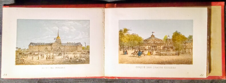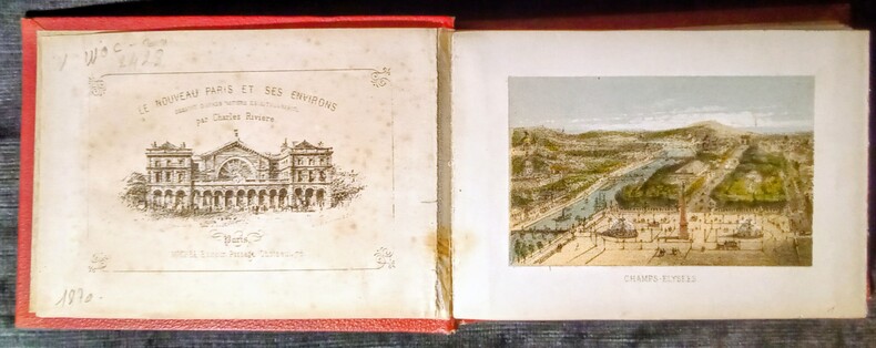 Dessiné d'après Nature et Lithographie par Charles Rivière. 23 planches en couleurs repliées en accordéon, dissensions de la gravure (10x6,3cm) avec les marges (13,5x9,5cm) et 1 gravure en noir et blanc de page de titre. Paris, Michel, Éditeur , Passage Choiseul, 78. Sans date (vers 1878) in-12 (15x10,5cm) percaline rouge éditeur, avec le titre en doré un peu passé dans un encadrement.